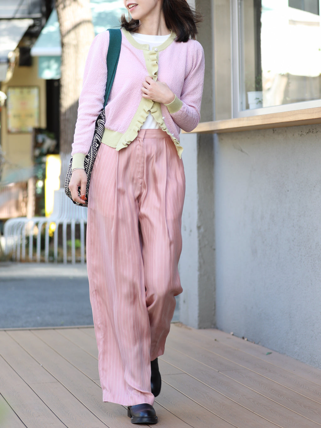 Pink Contrast Trim Ruffle Button Pearl Accent Knit Cardigan