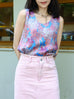 Blue Floral Round Neck Breezy Silk Tank