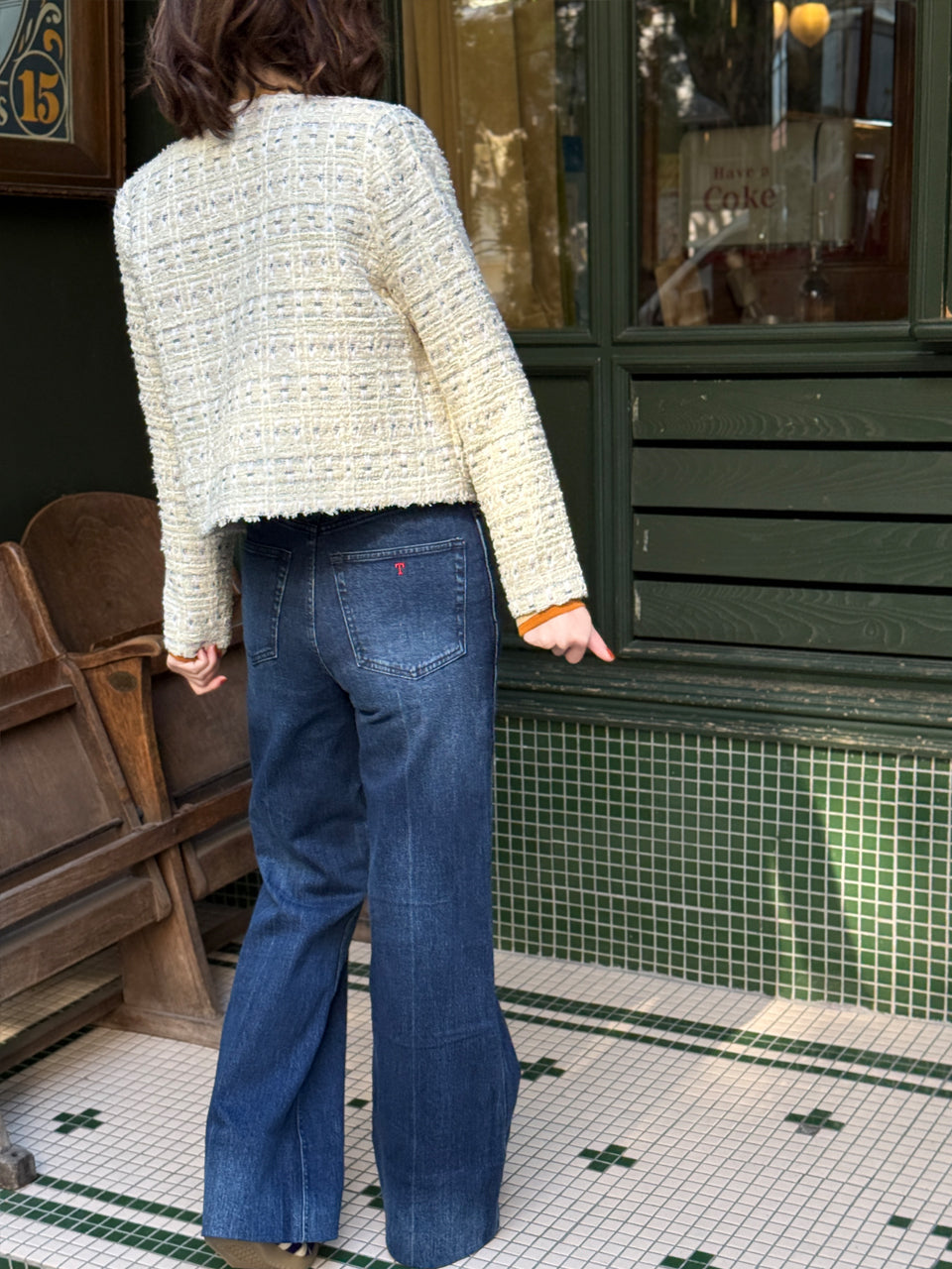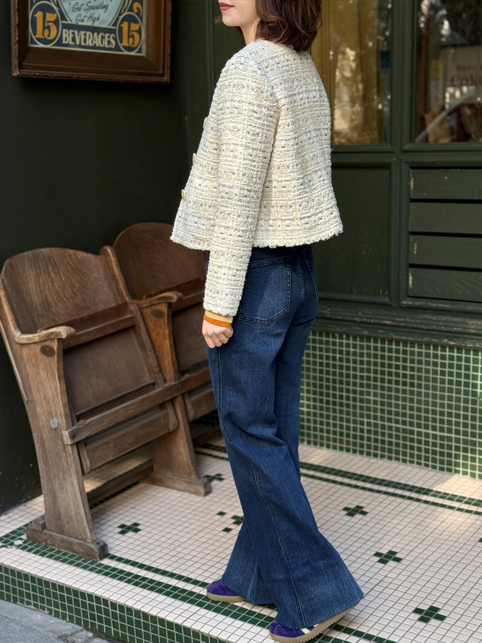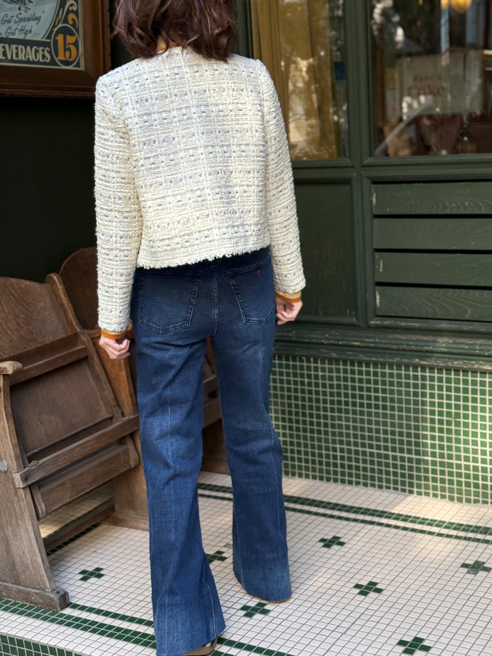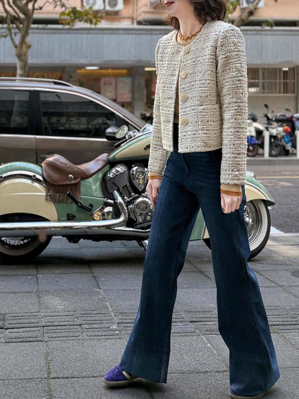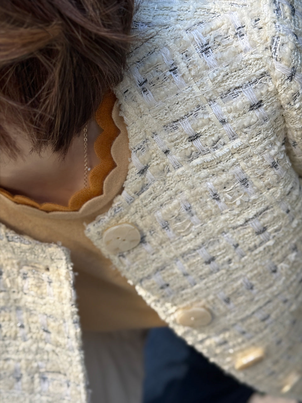 This boxy jacket design to bring a modern classy mood to your wardrobe. With four charming mother of pearl buttons fastening down the front, in a shorter length, cropped to your waist and tailored from Luxe Linton Tweed. Amazing with high-waisted trousers – and utterly timeless. Wear with lightweight blouse for dinner party or woollen cardi to keep you warm.