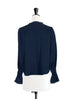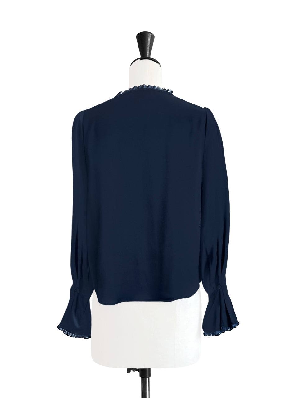 This is a weightless silky blouse perfectly for you to wear from Autumn to Spring. Our signature flared cuff with dainty rouleau button design, delicate ruffled trims running through V-neck to the front and as well as the cuffs, slightly puff shoulder, just a fabulous dreamy drape and volume. Available in tonal navy and contrasting sangria.