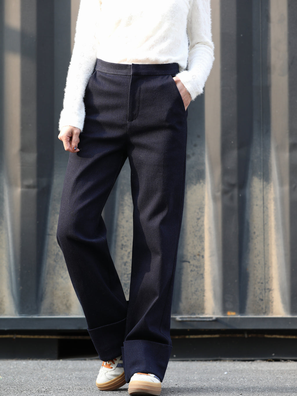These straight-leg trousers are tailored in a deep navy wool blend, designed with clean lines and a statement folded hem for a modern, elongating silhouette. Soft yet structured, they balance comfort with quiet sophistication—ideal for creating polished, easygoing outfits for the cooler season.