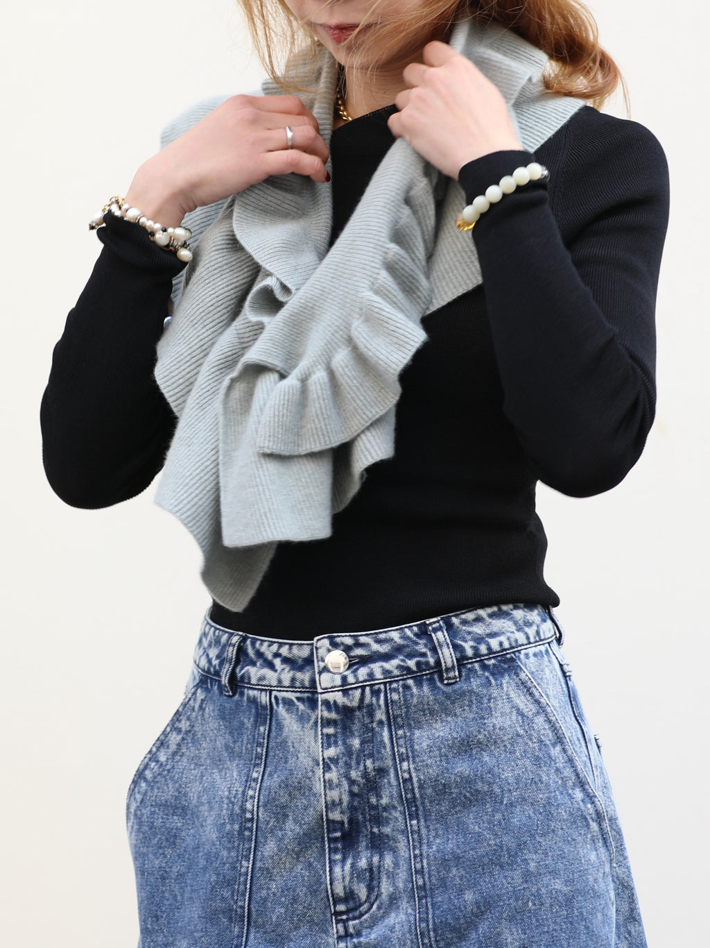Wrap yourself in warmth and style - This elegant scarf drapes perfectly around your neck, adding a cozy layer to any kinds of cardigan, coat, or blouse. Crafted from pure luxe cashmere with one wide and one narrow ruffle, it offers versatile styling options to wrapping around the neck. Welcome this lovely bright blue to the family!