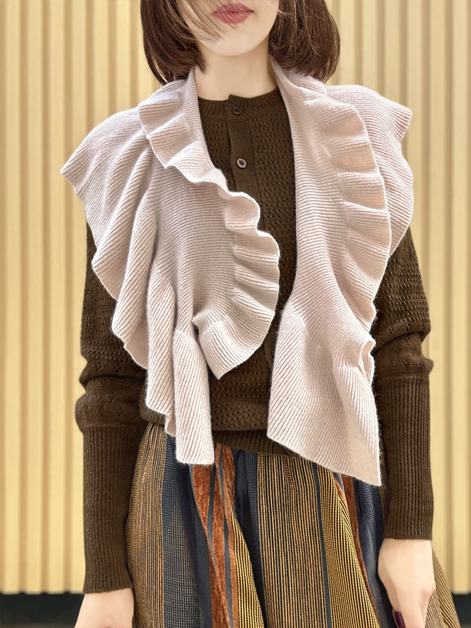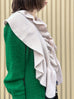 Wrap yourself in warmth and style - This elegant scarf drapes perfectly around your neck, adding a cozy layer to any kinds of cardigan, coat, or blouse. Crafted from luxurious cashmere with one wide and one narrow ruffle, it offers versatile styling options to wrapping around the neck. Available in beige, jade, black, and soft brick for an effortlessly chic look.