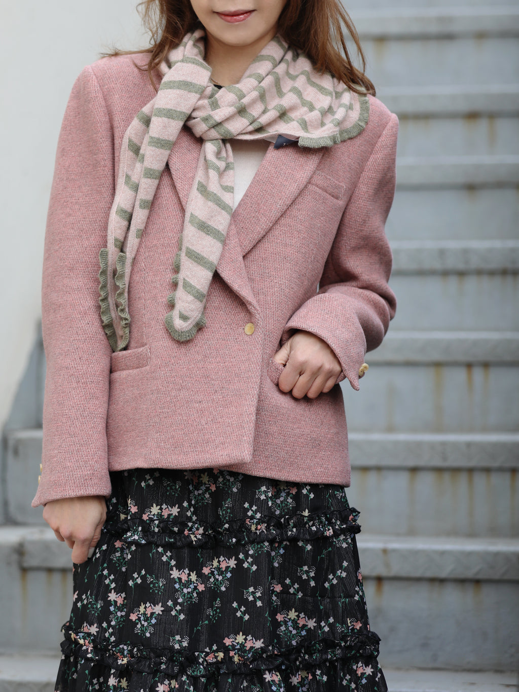 Made from a luxurious half cashmere and half wool, this triangle scarf showcases classic stripes finished with delicate ruffle trims. Lightweight yet warming, it drapes beautifully around the neck or shoulders. A charming layering piece that adds texture, colour, and cosy elegance to coats, blazers, and knitwear alike. Available in three colour combination to choose from: Navy/ White; Sage/ Blush; Purple/ Pink.