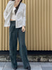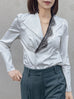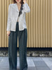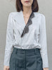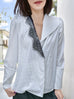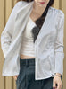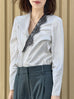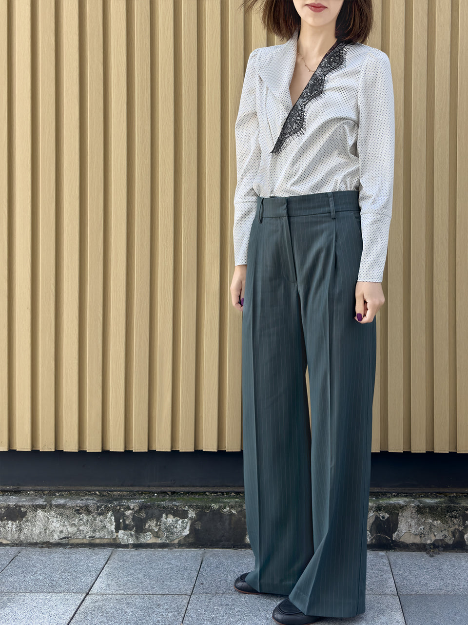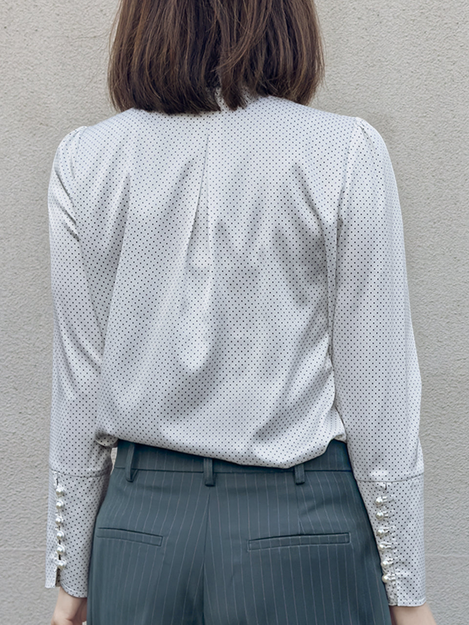 Crafted from lightweight pin-dot fabric and designed for a relaxed fit, features an elegant double-breasted closure. The shirt’s unique design includes extended cuffs, adorned with elegant pearl buttons, and a single eyelash lace accent on one side of the collar. This versatile piece easily transitions from office to casual settings, pairing beautifully with pants, skirts, or as a light outer layer.