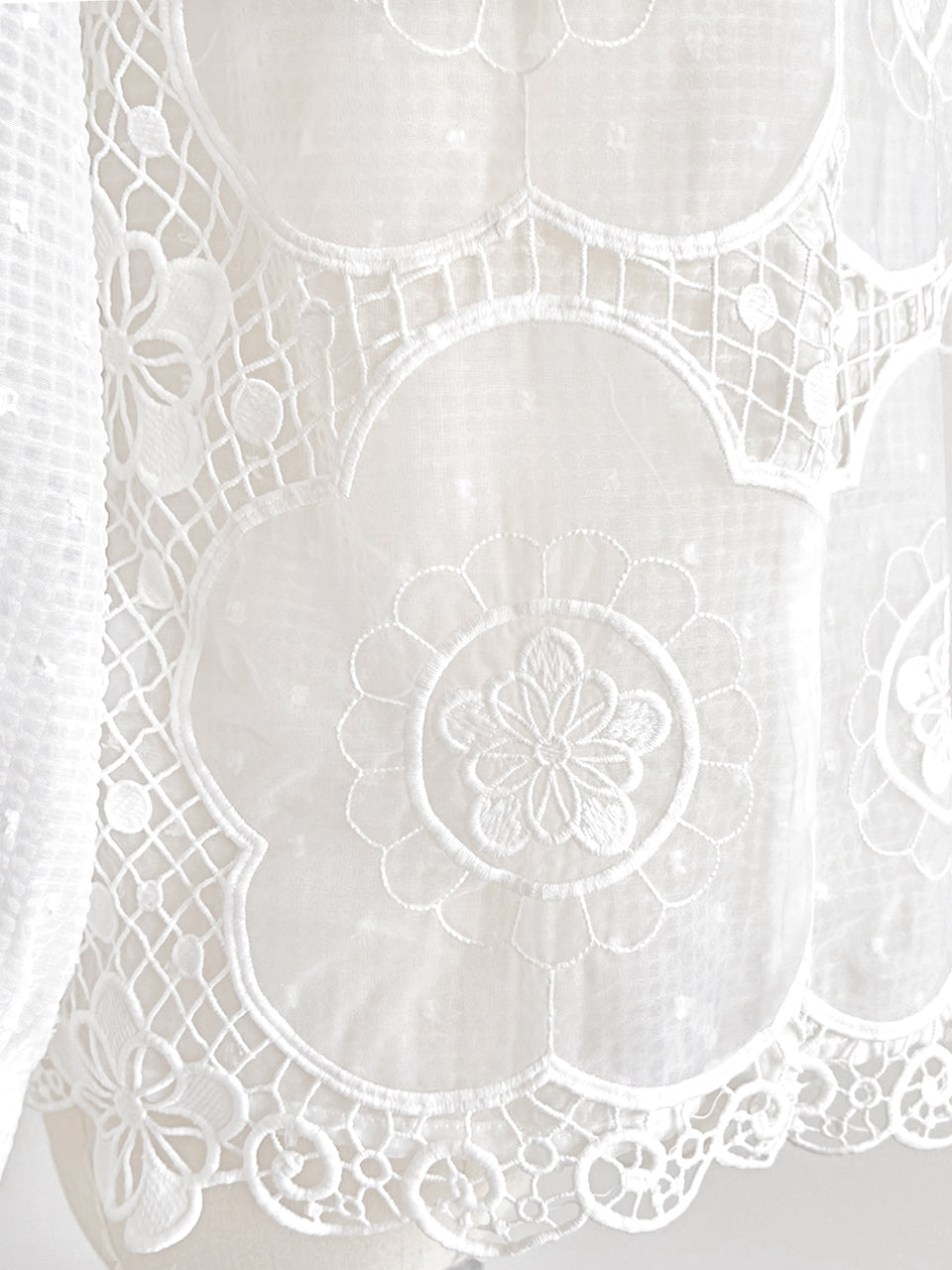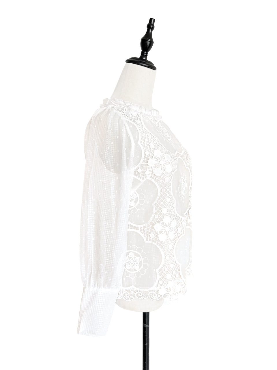 Lace is always in season - embroidered lace layered with airy fabric same as filmy sleeves to refresh this ruffle collared shirt. Detailing renders a delicately romantic look on this breezy blouse with long balloon sleeves and floral-scalloped trim, making it a sophistication addition to both your polished and more casual looks