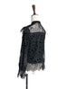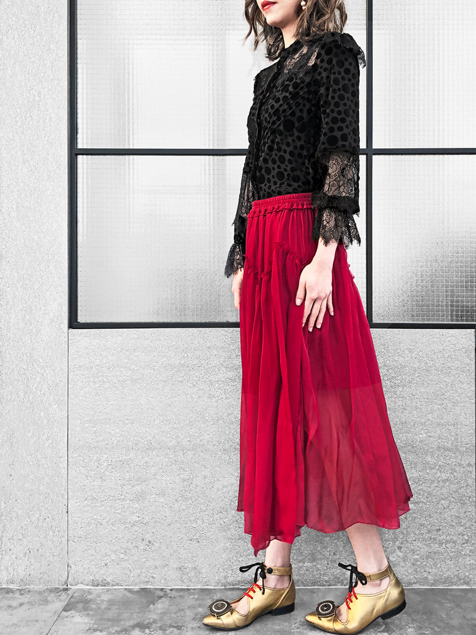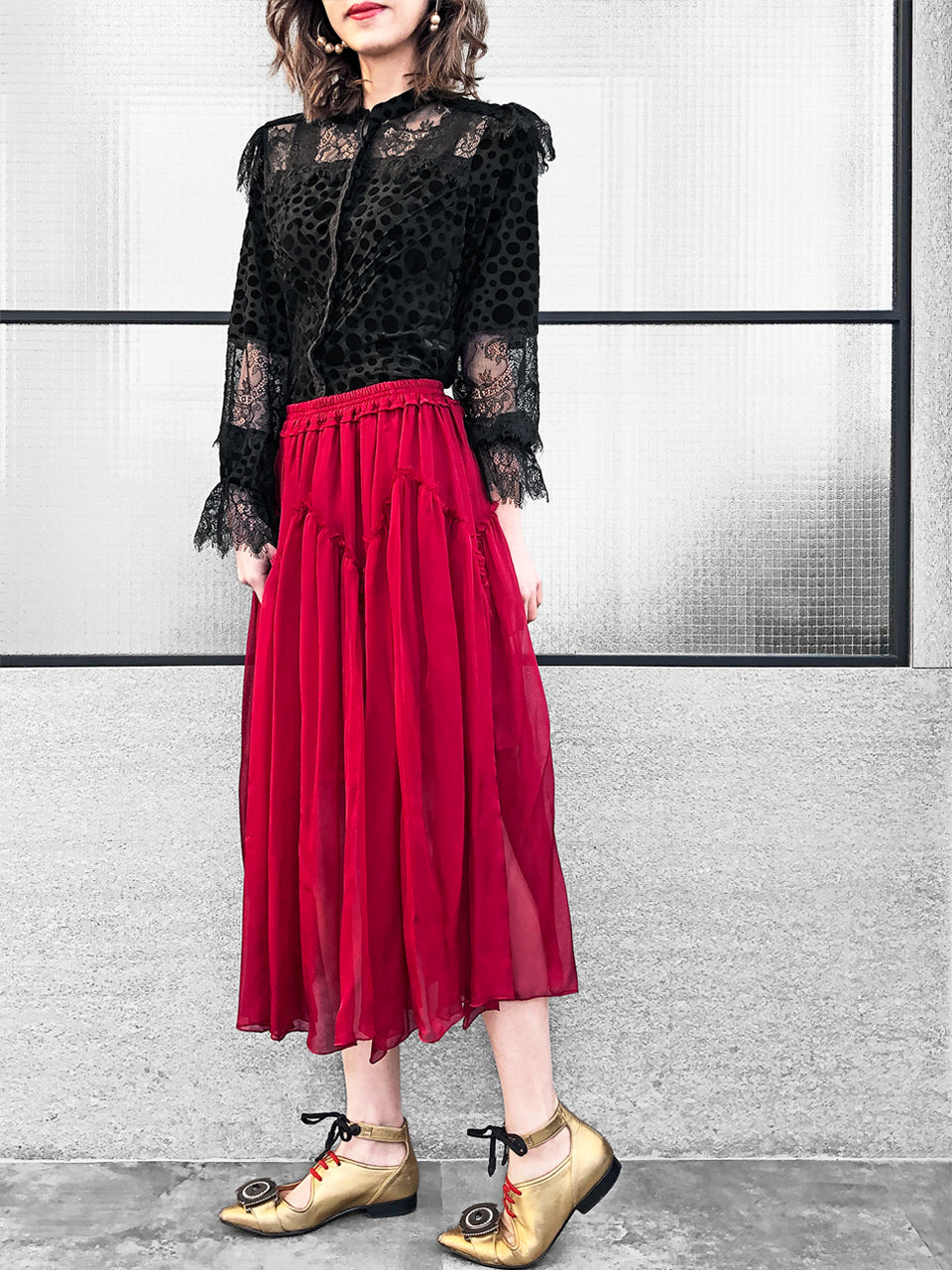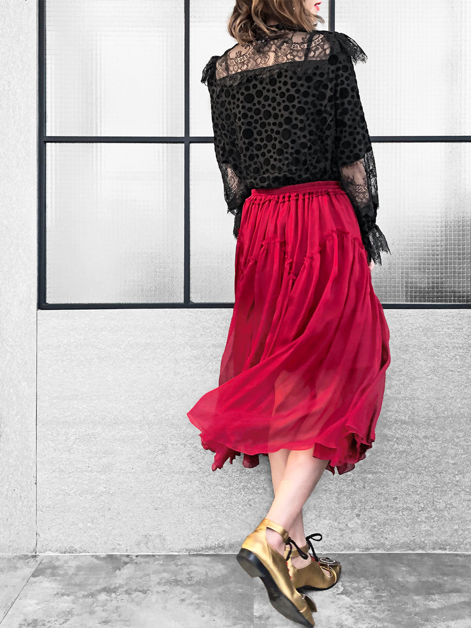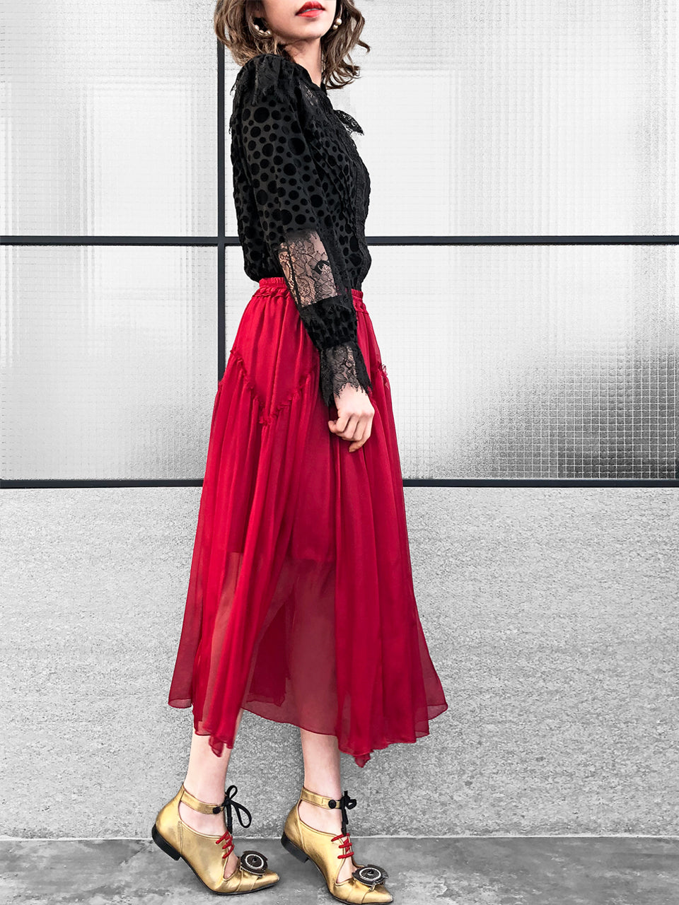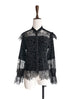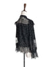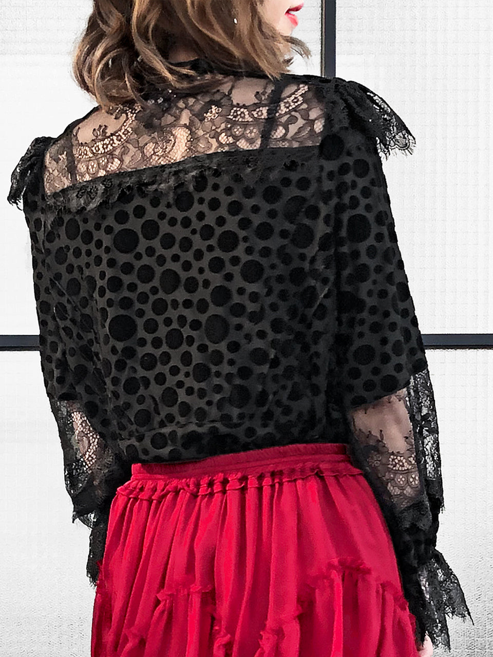 The romantic eyelash lace insets of this blouse contribute to the vintage aesthetic, accented by the delicately-crafted frilly lace ruffles on the shoulders, cuffs and hem. Sturdy velvet dotty fabric complements the intricate fringed lace details, creating a timelessly sophisticated long-sleeved blouse. It is a fashionable piece that is both comfortable and elegant.