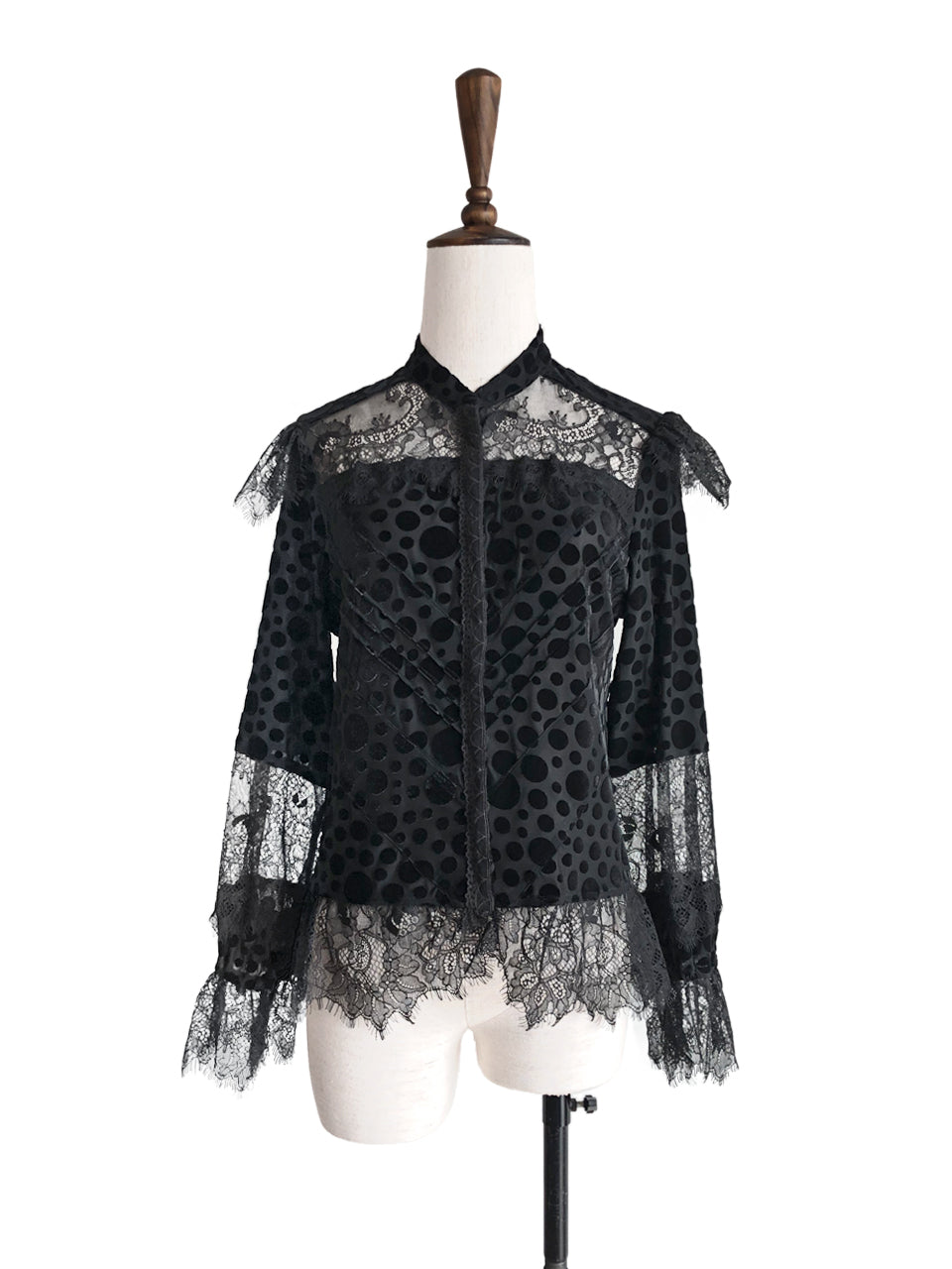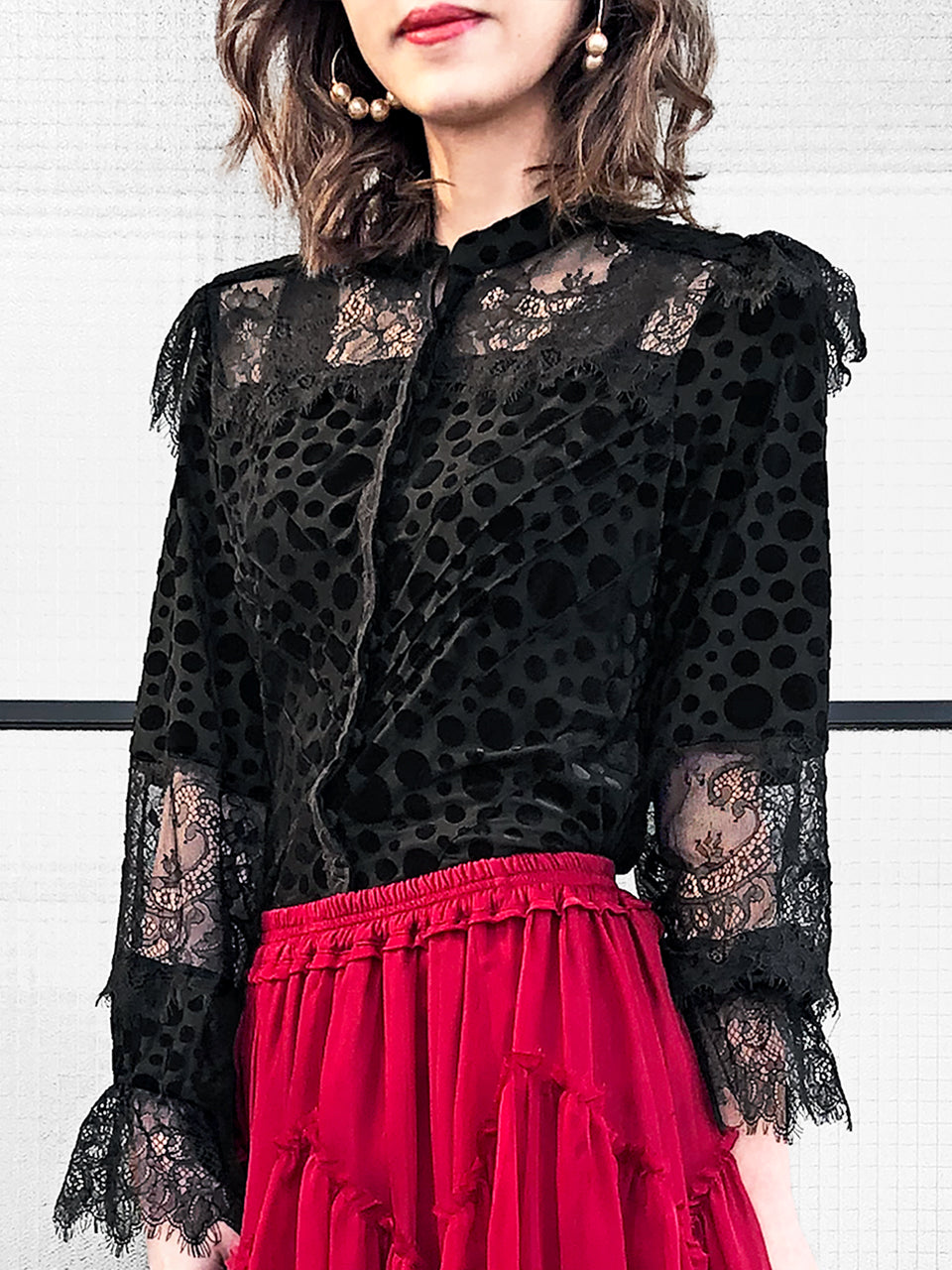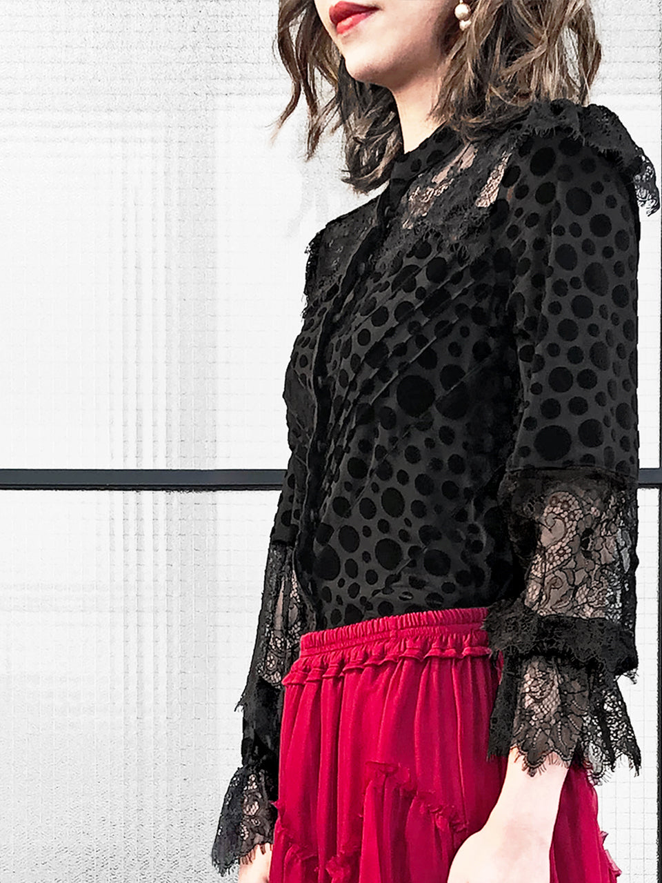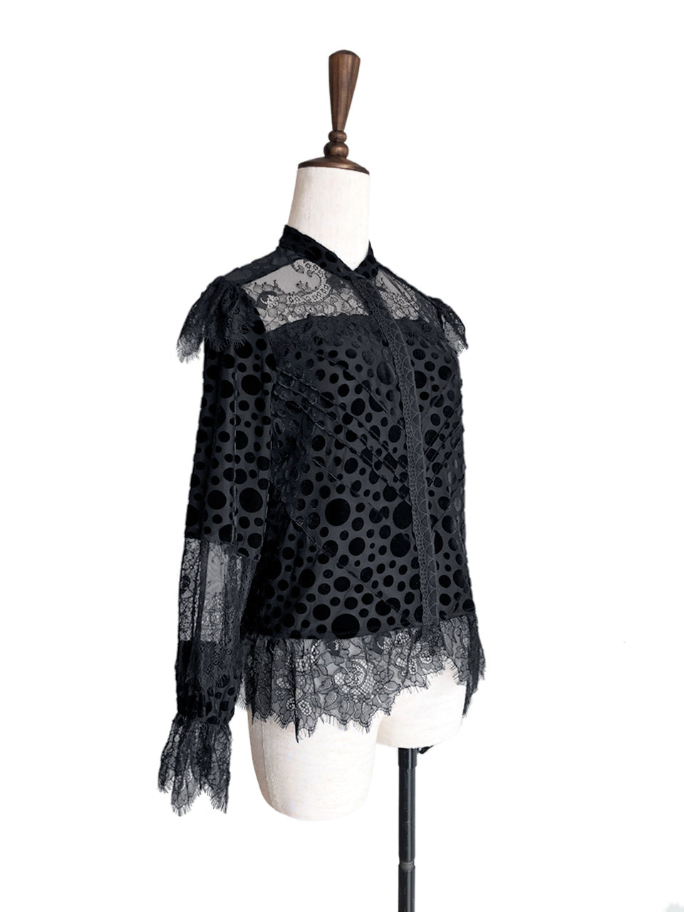 Further Sale! Velvet Dotty Black Eyelash Lace Trim Long Sleeve Blouse