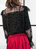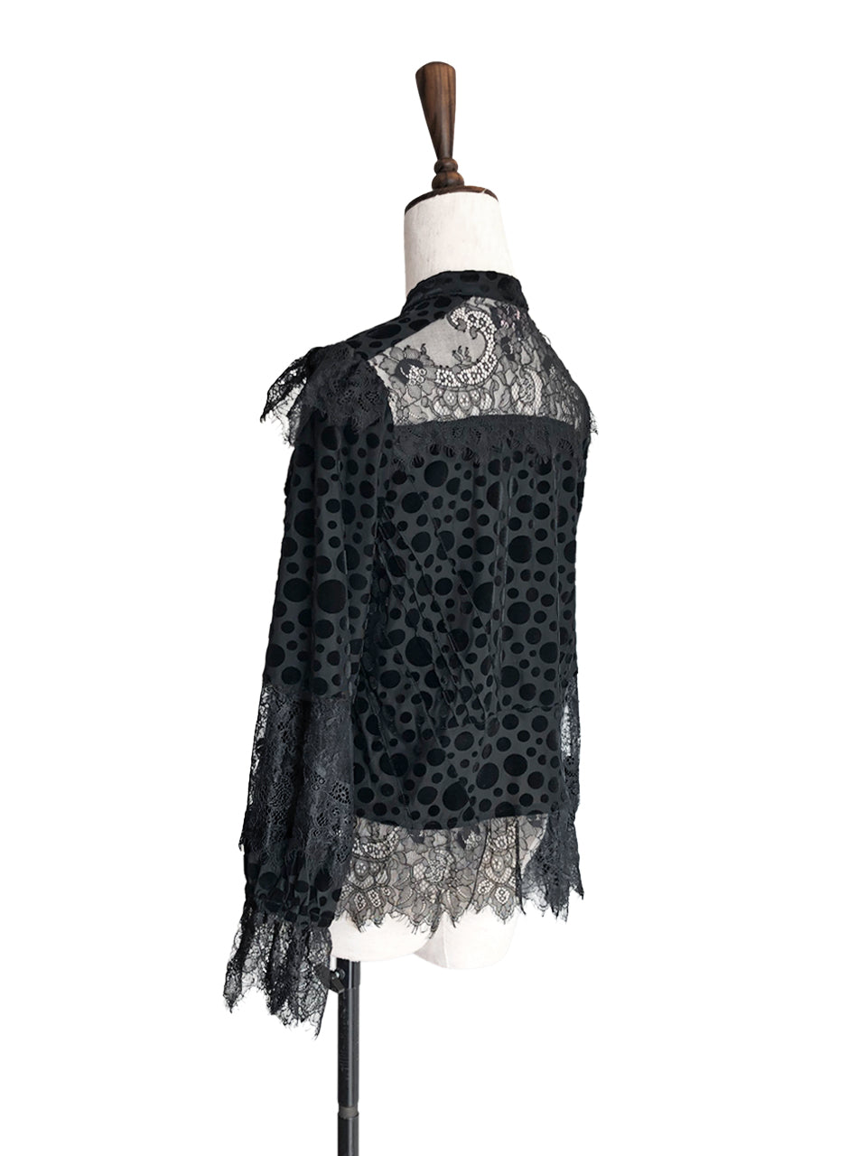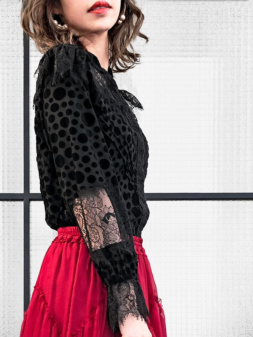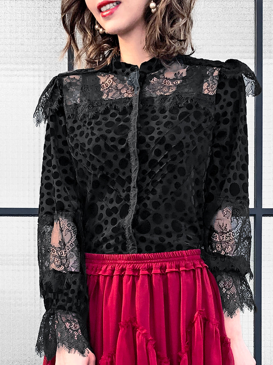 Further Sale! Velvet Dotty Black Eyelash Lace Trim Long Sleeve Blouse