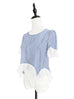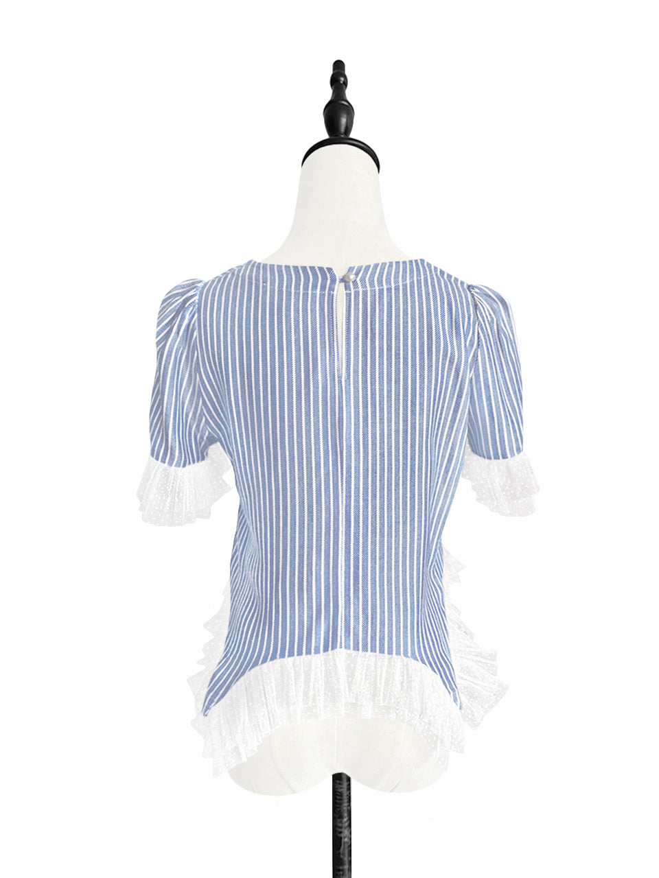 Our fail-safe way to make a classic top mega stylish? Well, it’s all in the details. The ruffled asymmetrical hem makes an instant statement, and we've given the short sleeves a feminine touch with an upgrade of dotty lace frilly cuffs and puffed shoulders. Plus a super comfy dolly-cut and a detailed back keyhole opening with a pearly button for a sophisticated finish.