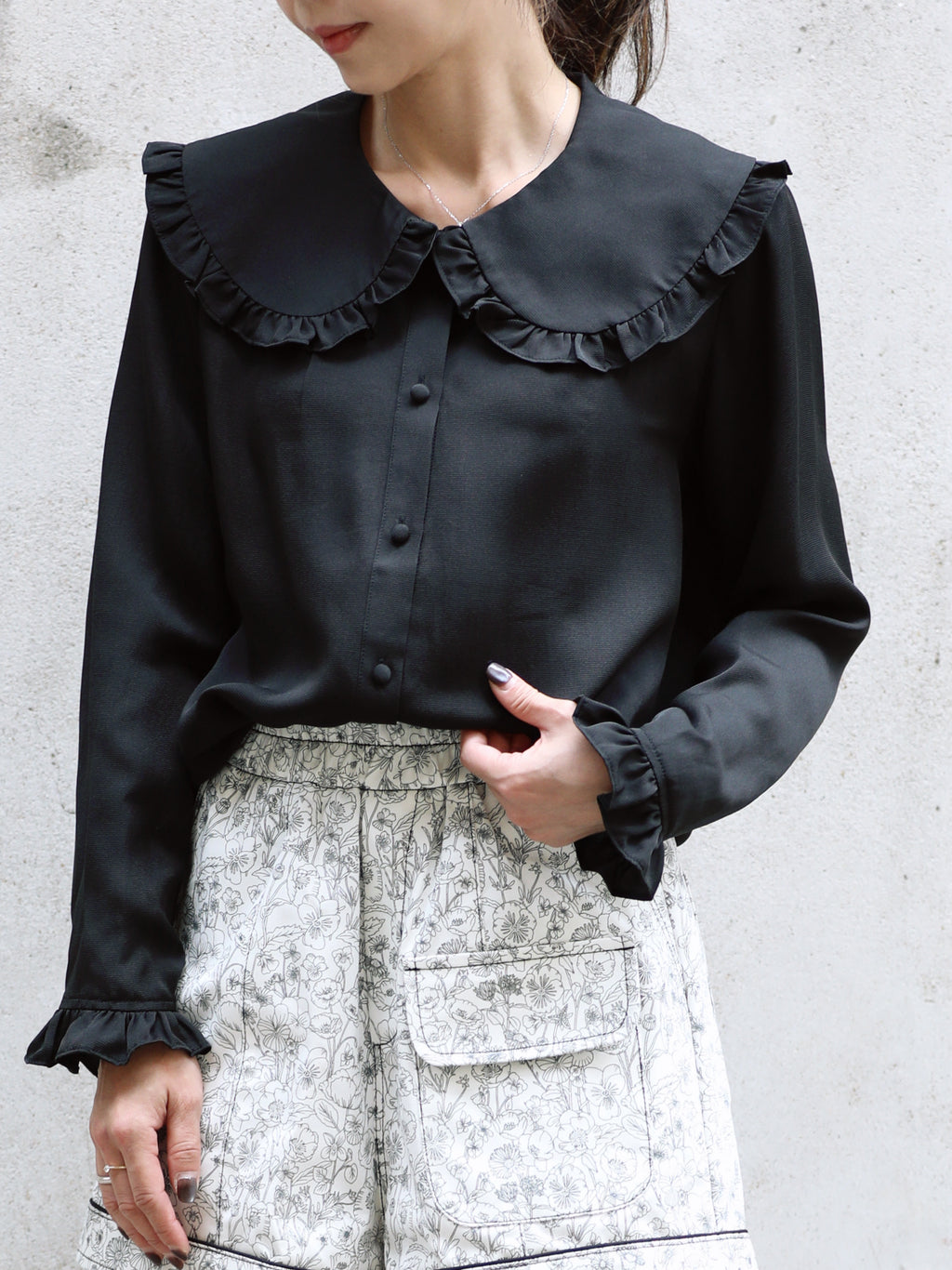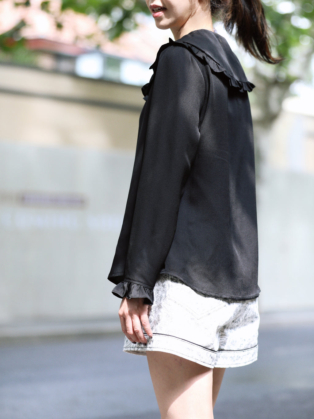 Classic Black Ruffle Collar Long Sleeve Button Silky Blouse