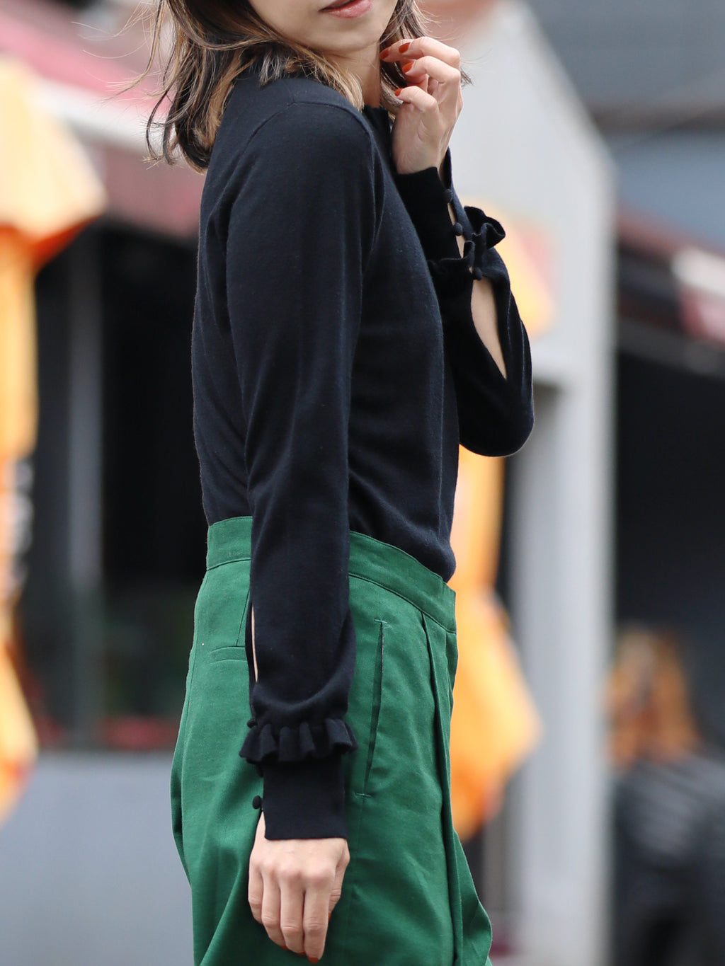 Classic Black Ruffle Trim Button Cuff Cashmere Wool Knit Jumper