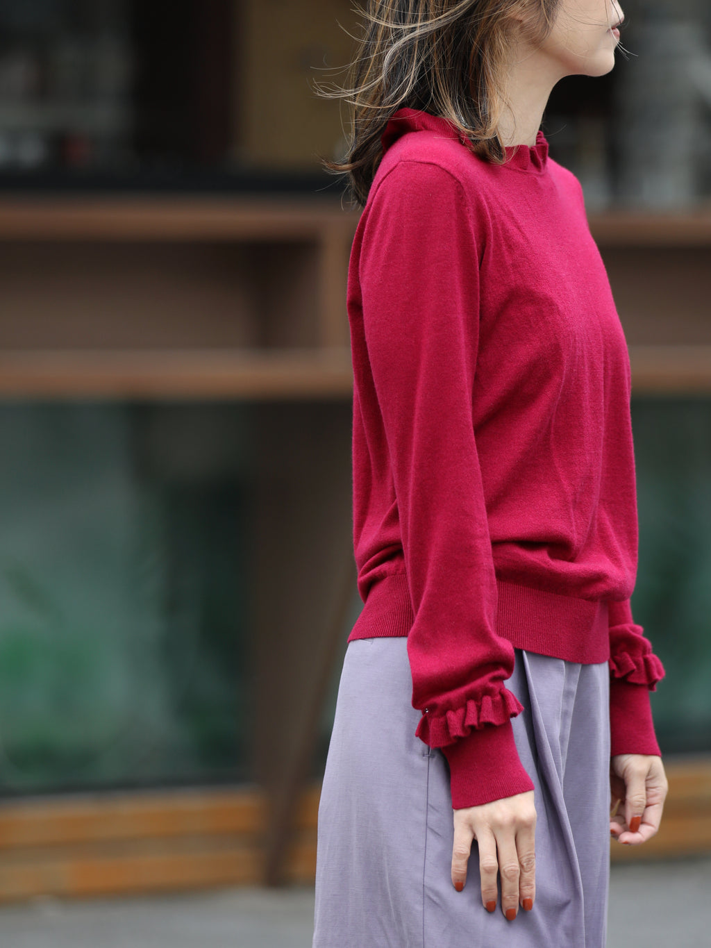 Wine Red Ruffle Trim Button Cuff Cashmere Wool Knit Jumper