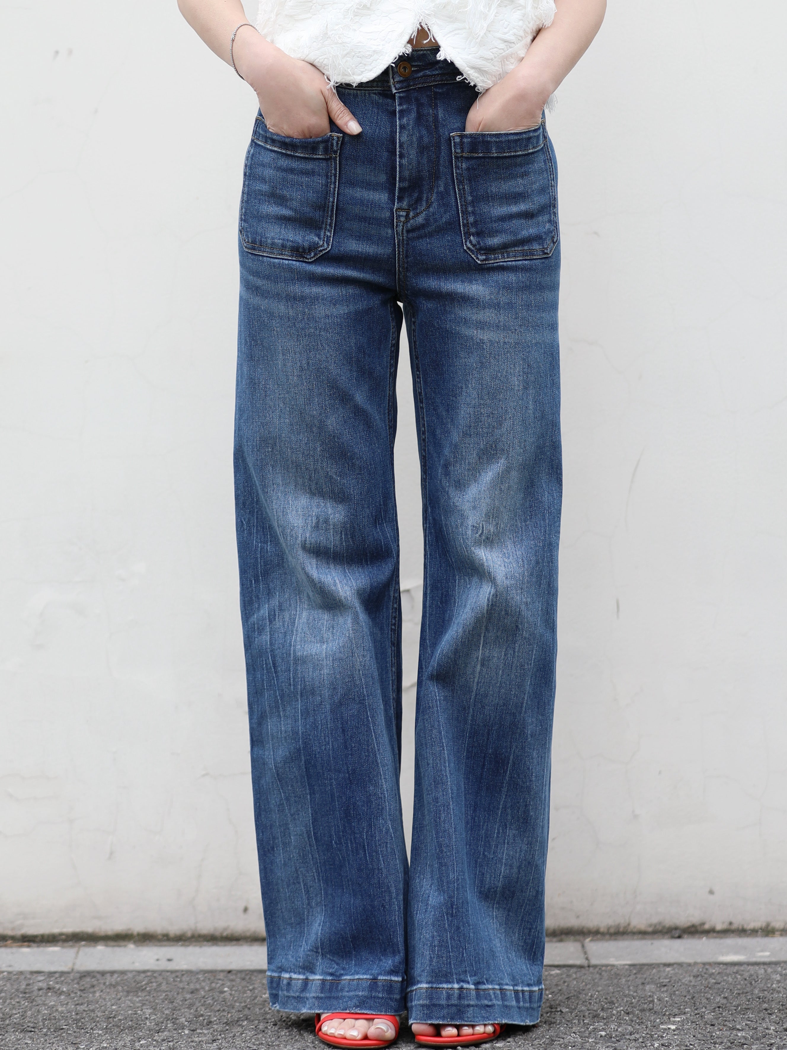 Crafted from structured denim with a softly worn vintage wash, these straight leg jeans offer a flattering high-rise fit and elongated silhouette. Oversized front patch pockets add a modern utility touch while enhancing the streamlined shape. Easy to dress up or down, they bring effortless attitude to everyday styling with comfort and timeless appeal throughout every season.