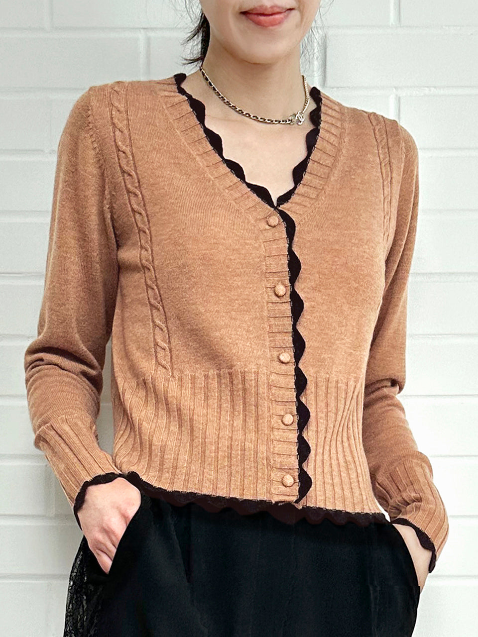 Introducing an upgraded version of our highly popular cashmere wool blend cardigan. We've added our signature contrasting trim to enhance our beloved scalloped detail. Delicate scallops elegantly adorn the edges of this cropped, boxy cardigan, adding a casual, effortless charm to dresses, and it pairs perfectly with jeans and tees. Available in three delightful colour combinations: Beige/Black, Blue/Orange, and Red/Burgundy.