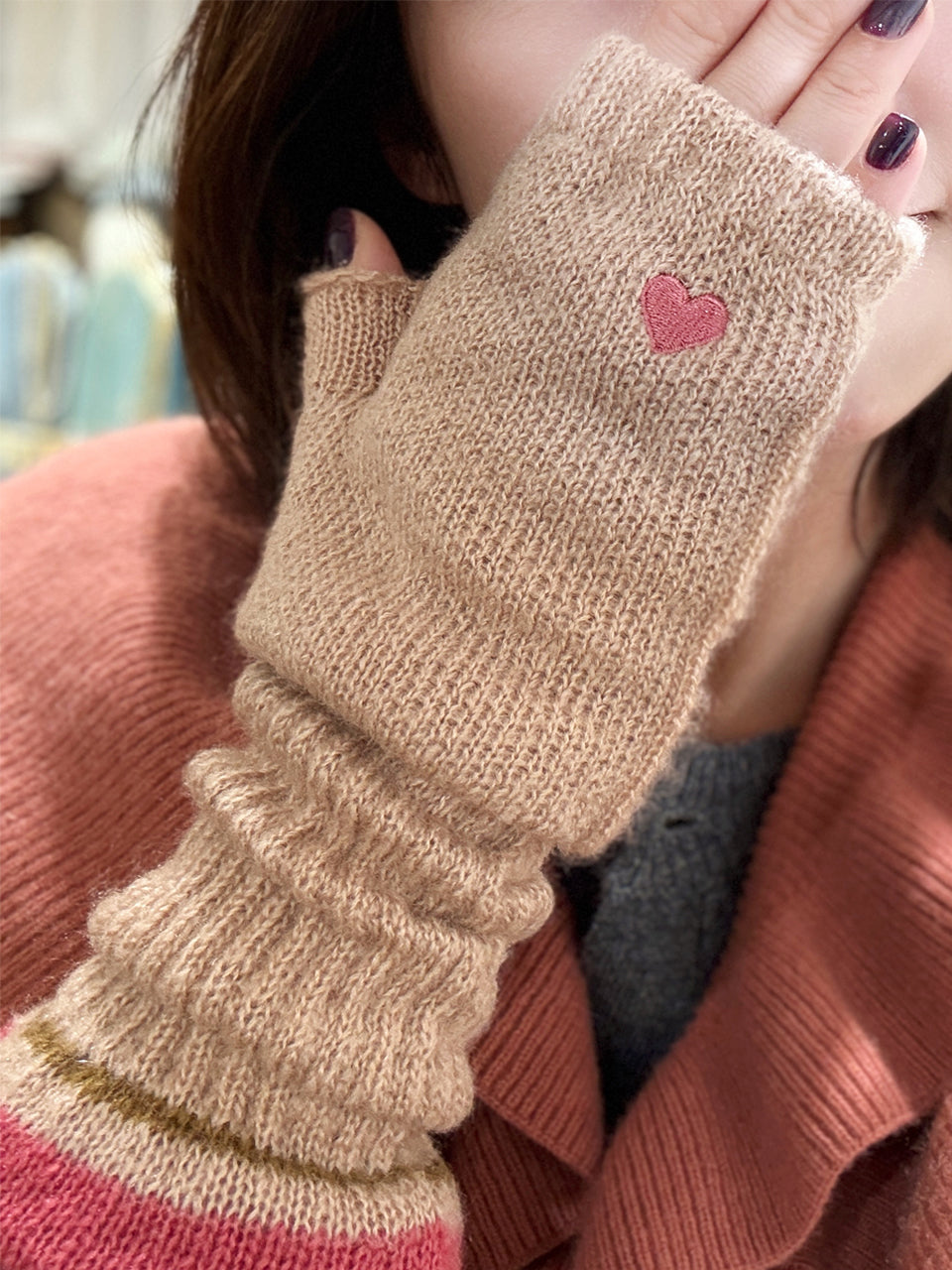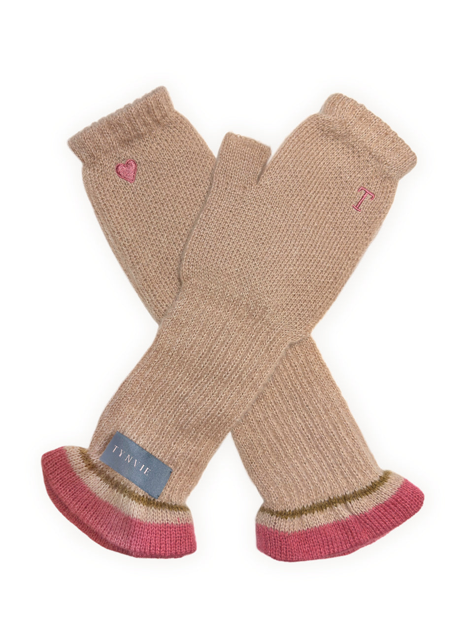 Beige Pink Heart/ Logo Embroidered Ruffle Knitted Mittens