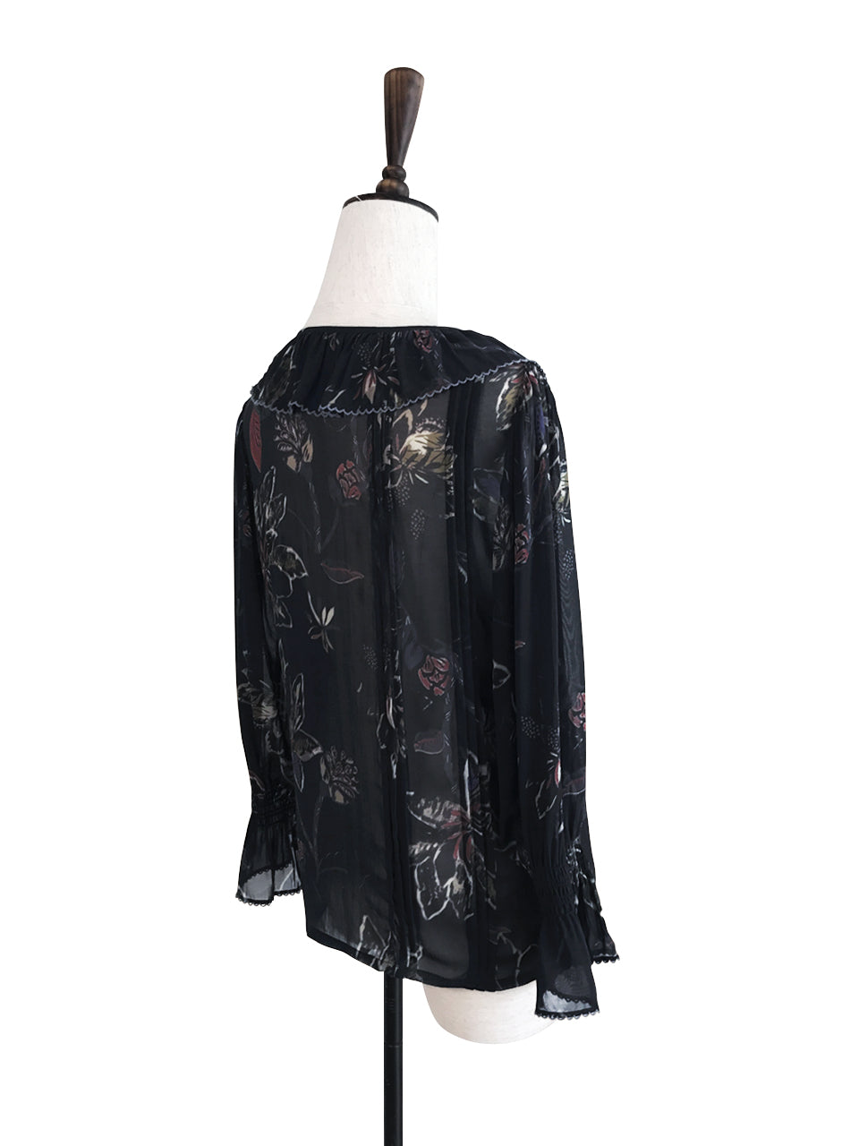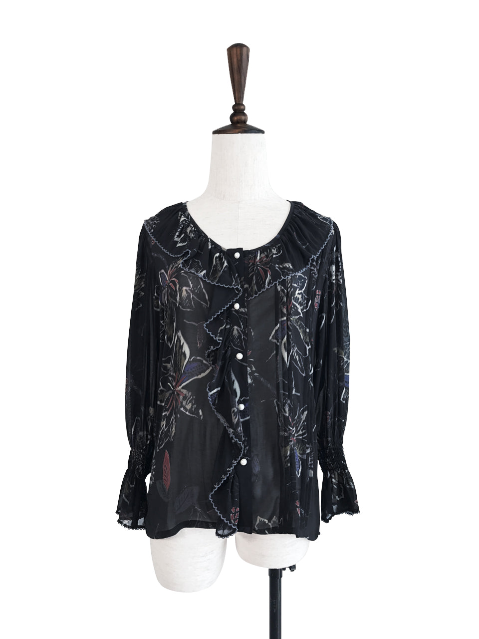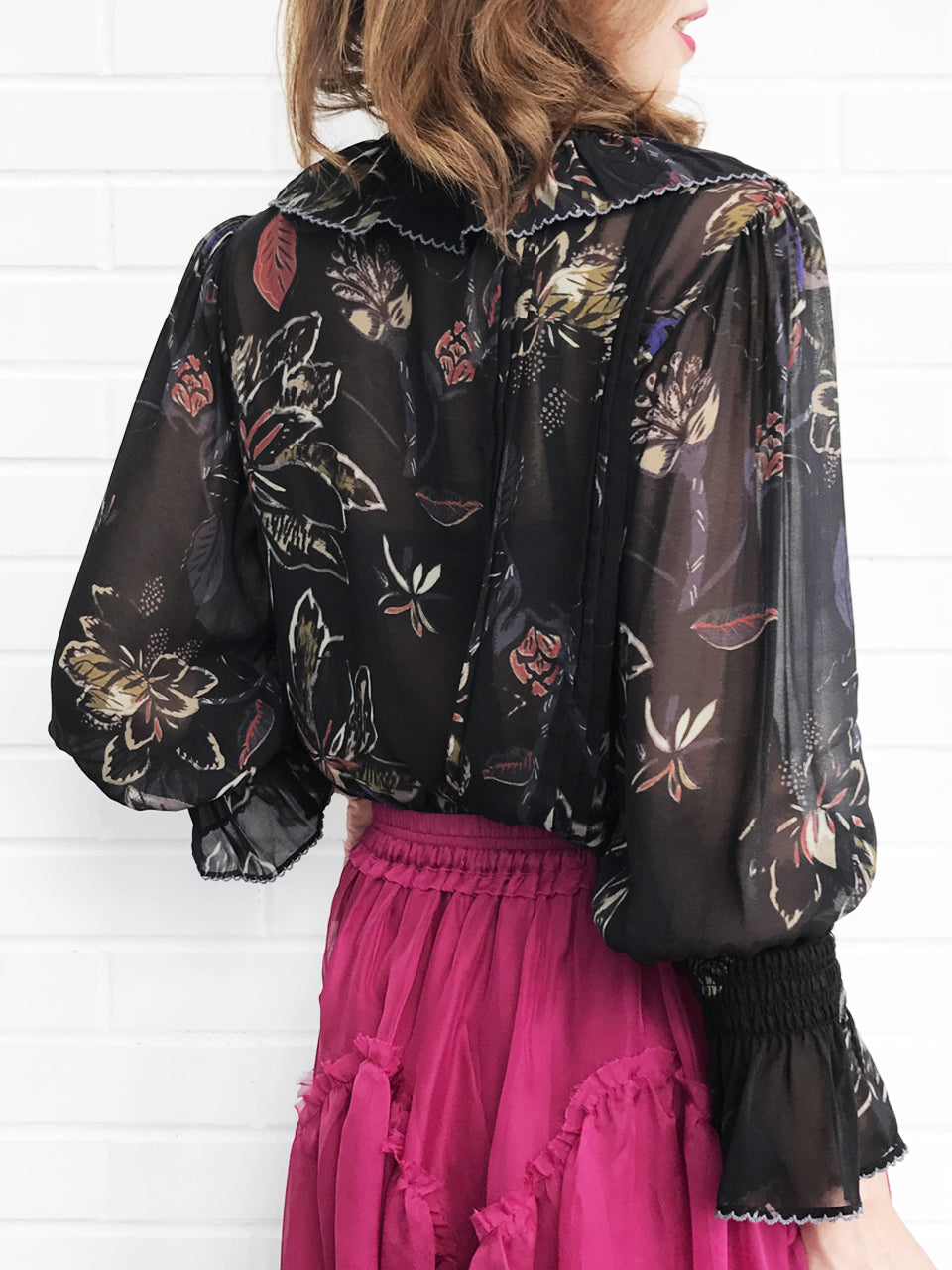 Boasting pin-tucked pleats and smocked flare cuffs, this airy light-weighted blouse is adorned with fluttery ruffles that cascade down the neckline, creating an eye-catching movement. An elegant georgette finish pairs perfectly with the romantic floral pattern, granting a delicate textural twist to this feminine piece.