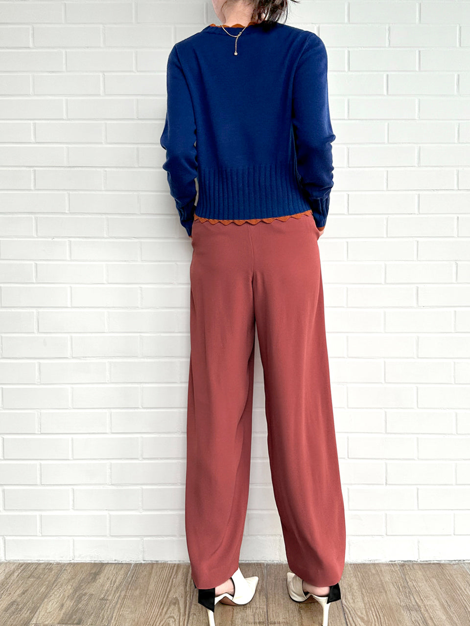 Introducing an upgraded version of our highly popular cashmere wool blend cardigan. We've added our signature contrasting trim to enhance our beloved scalloped detail. Delicate scallops elegantly adorn the edges of this cropped, boxy cardigan, adding a casual, effortless charm to dresses, and it pairs perfectly with jeans and tees. Available in three delightful colour combinations: Beige/Black, Blue/Orange, and Red/Burgundy.