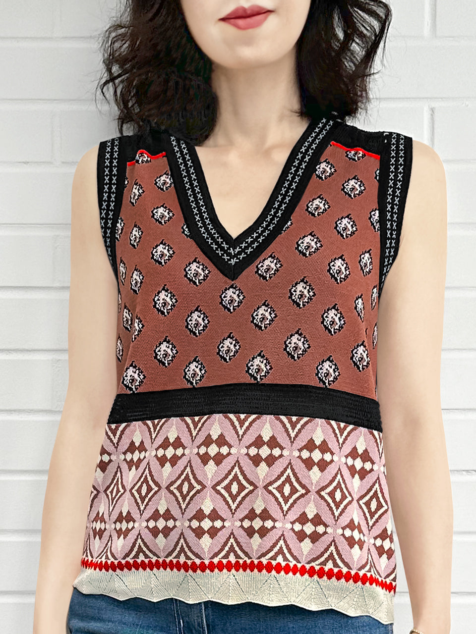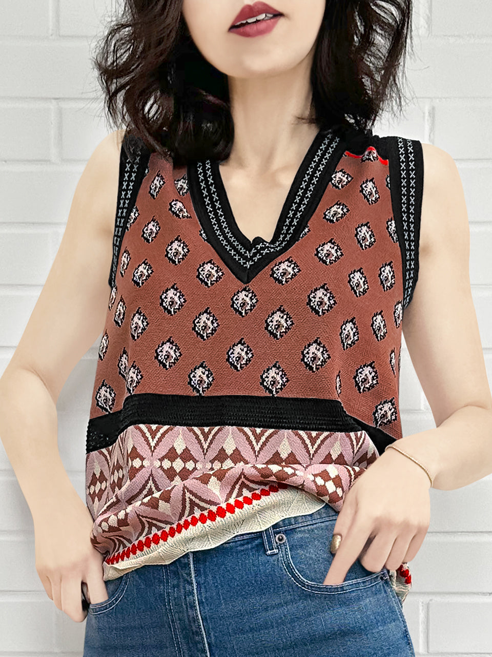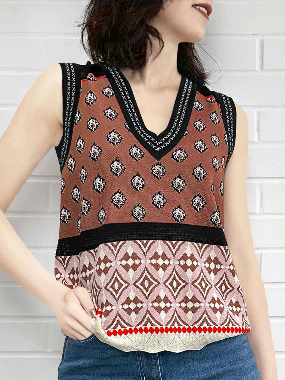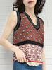 Final Sale! Chestnut Mosaic Pattern Knitted Sleeveless V-neck Sweater