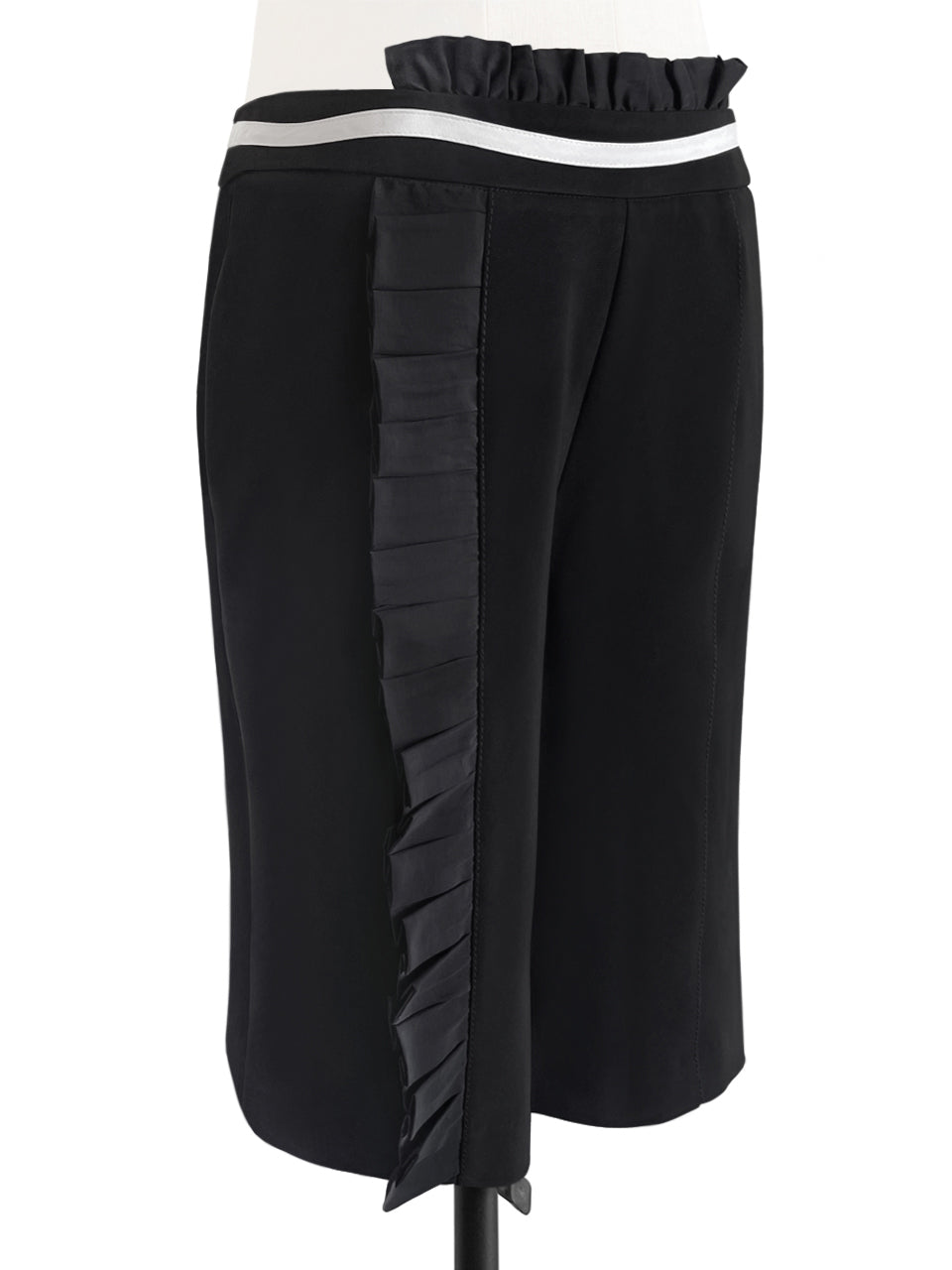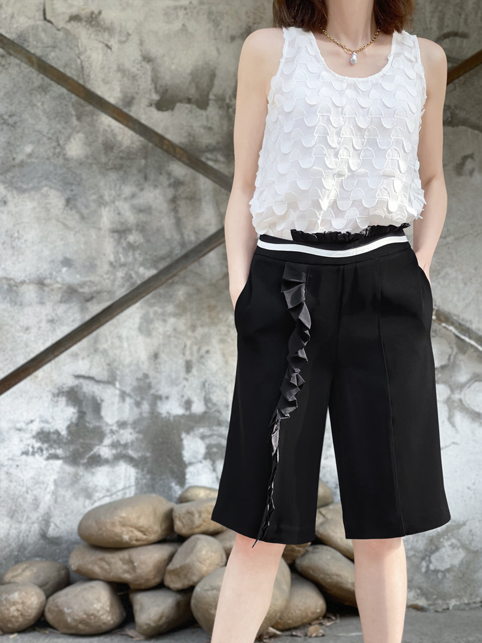 For easy summer dressing, look to our ruffled airy shorts. They have a flattering straight shape, with a hidden zip fly back closure to keep the clean look. Partially ruffled paperbag and contrast waive pattern on the deep waistband save your time for a matching belt (that's a wardrobe win right there), while pleated ruffle drape alike ribbon down from the waistline to hem to lengthen your legs. Favourite pockets at the sides are practical additions.