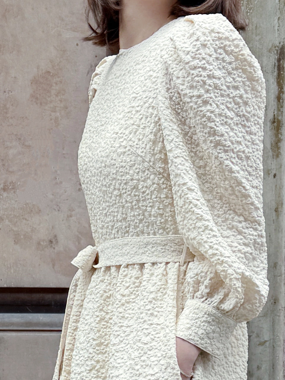 Timeless elegance meets everyday practicality! Our jacquard midi dress, available in two striking shades—classic black and soft ecru—boasts a jewel neckline, puffed shoulders, and a tonal sash tie waist for a figure-flattering silhouette. Complete with handy pockets (a must!) and breezy unlined sleeves, it’s a wardrobe staple that blends sophistication with effortless charm.