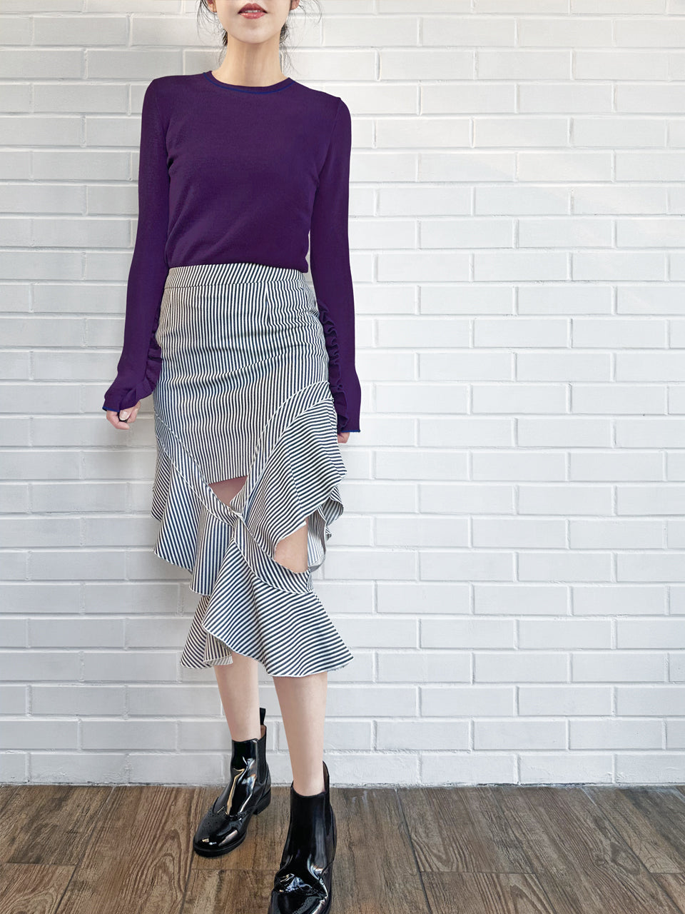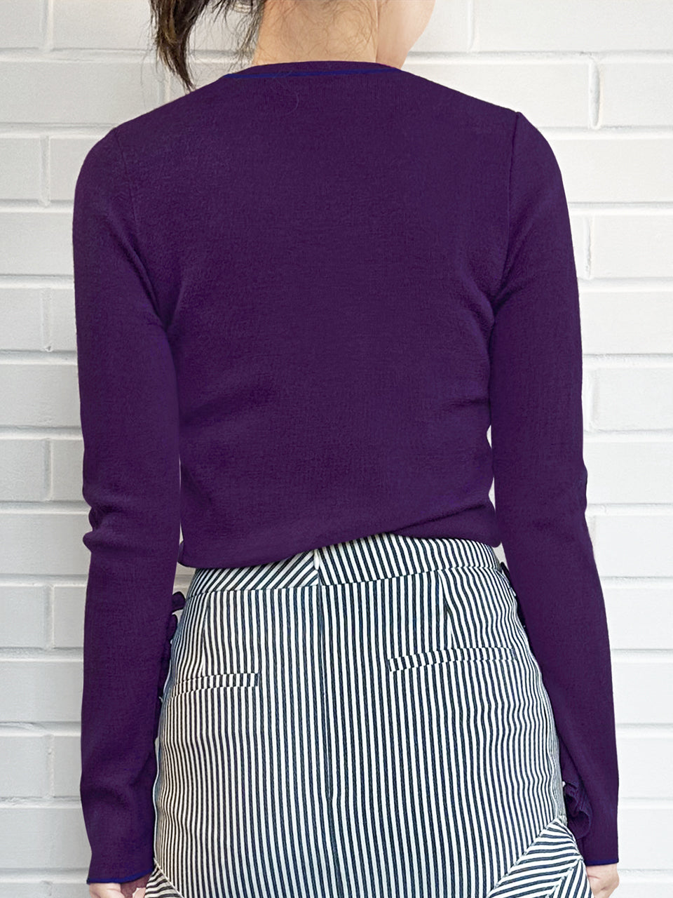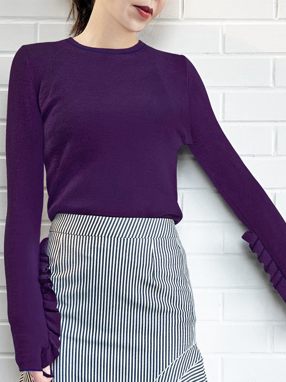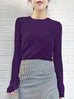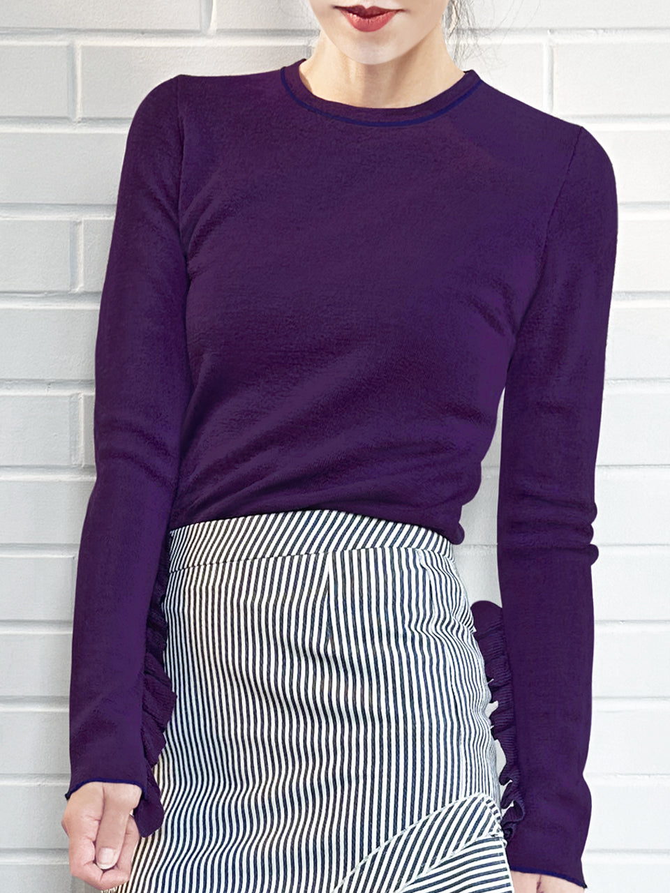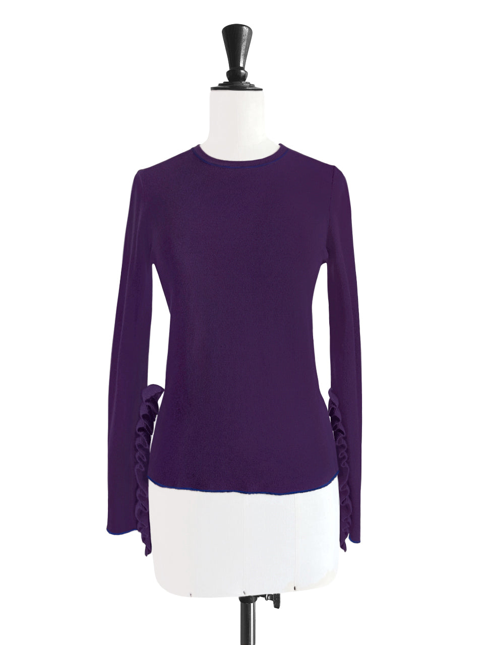 Anchor your transitional wardrobe with this staple long-sleeved jumper. This slim-fit, crew neck jumper boasts a modern design with thin contrasting trims at the collar, hem, and cuffs. Its standout feature is the extra-long sleeves with subtle thumb holes and playful ruffles from the elbows down. A must-have staple for a playful and chic wardrobe. Available in four beautiful colours: pale grey, purple, black and lavender blue.