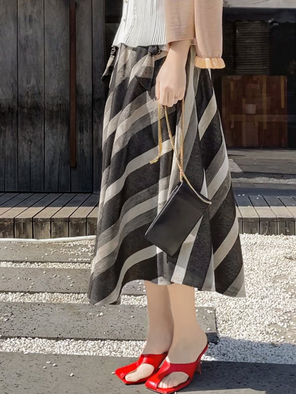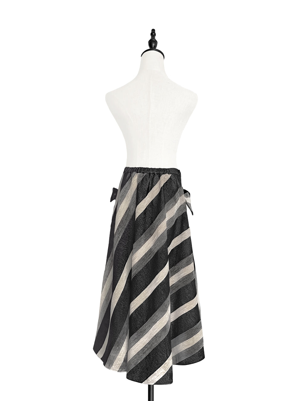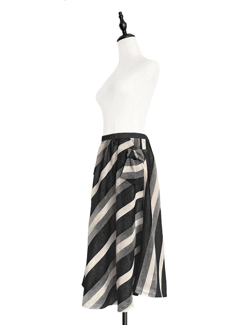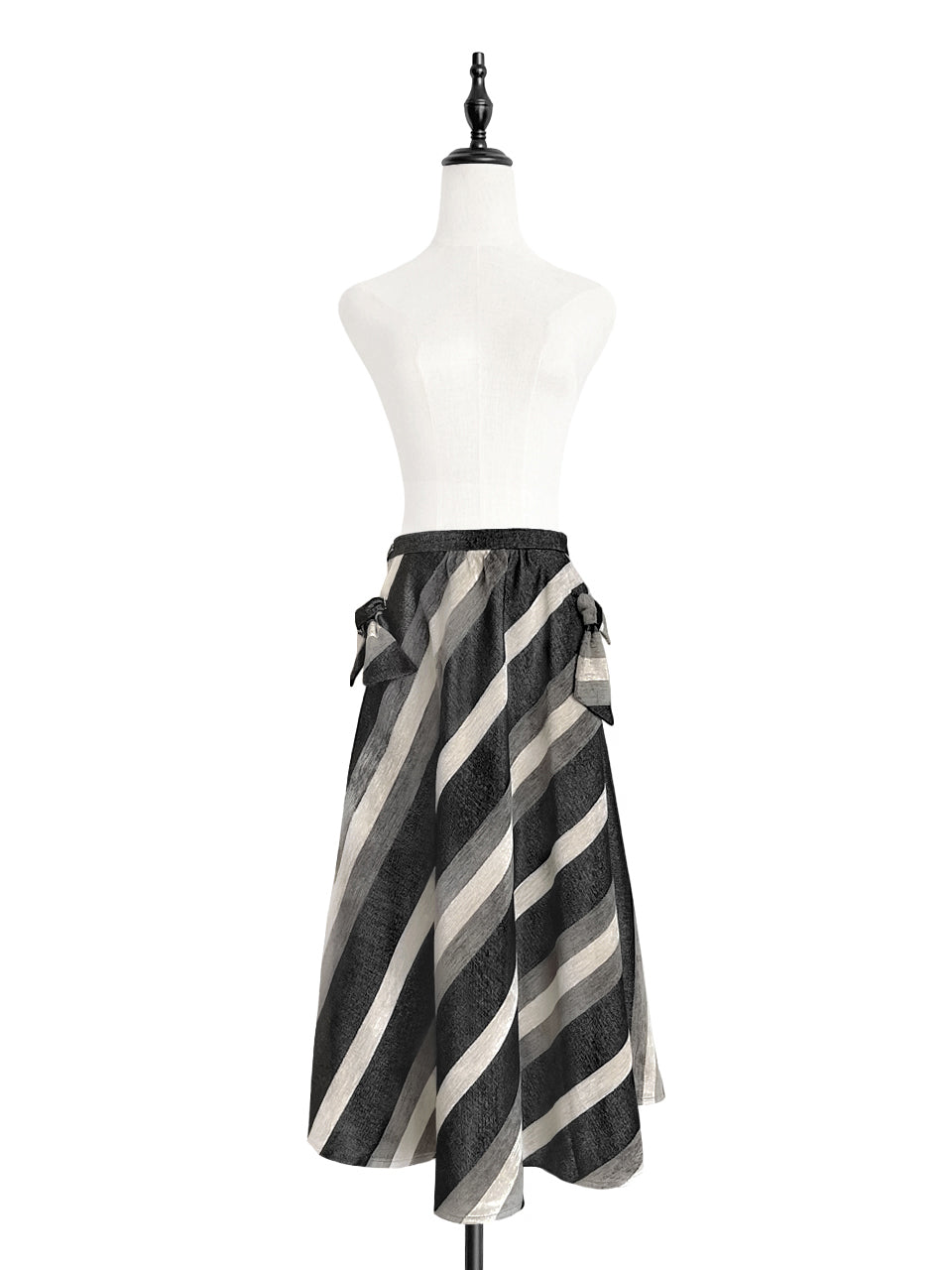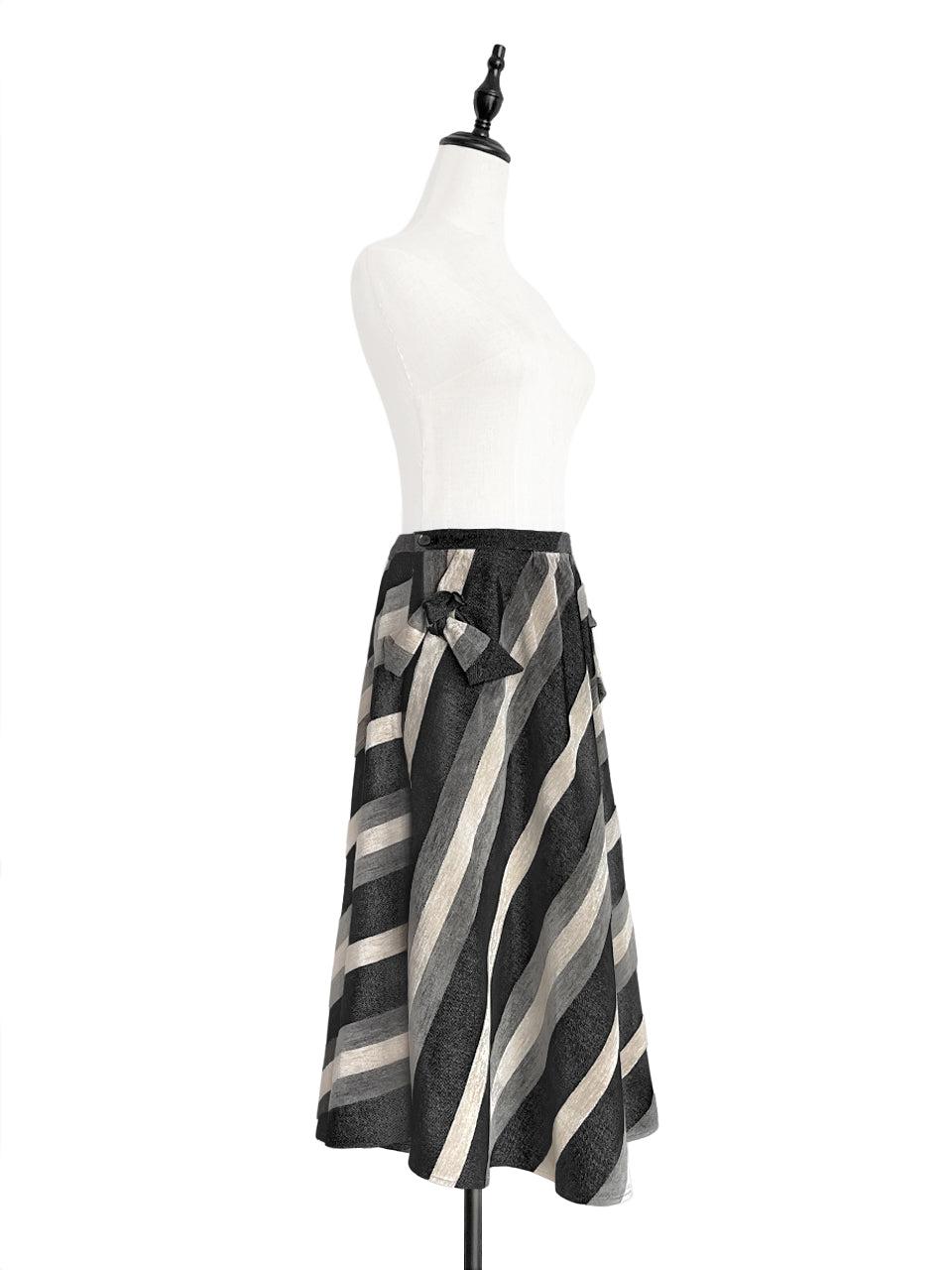 Surprise Sale! Velvet-Striped Denim Tie Bow Pockets Full Midi Skirt