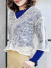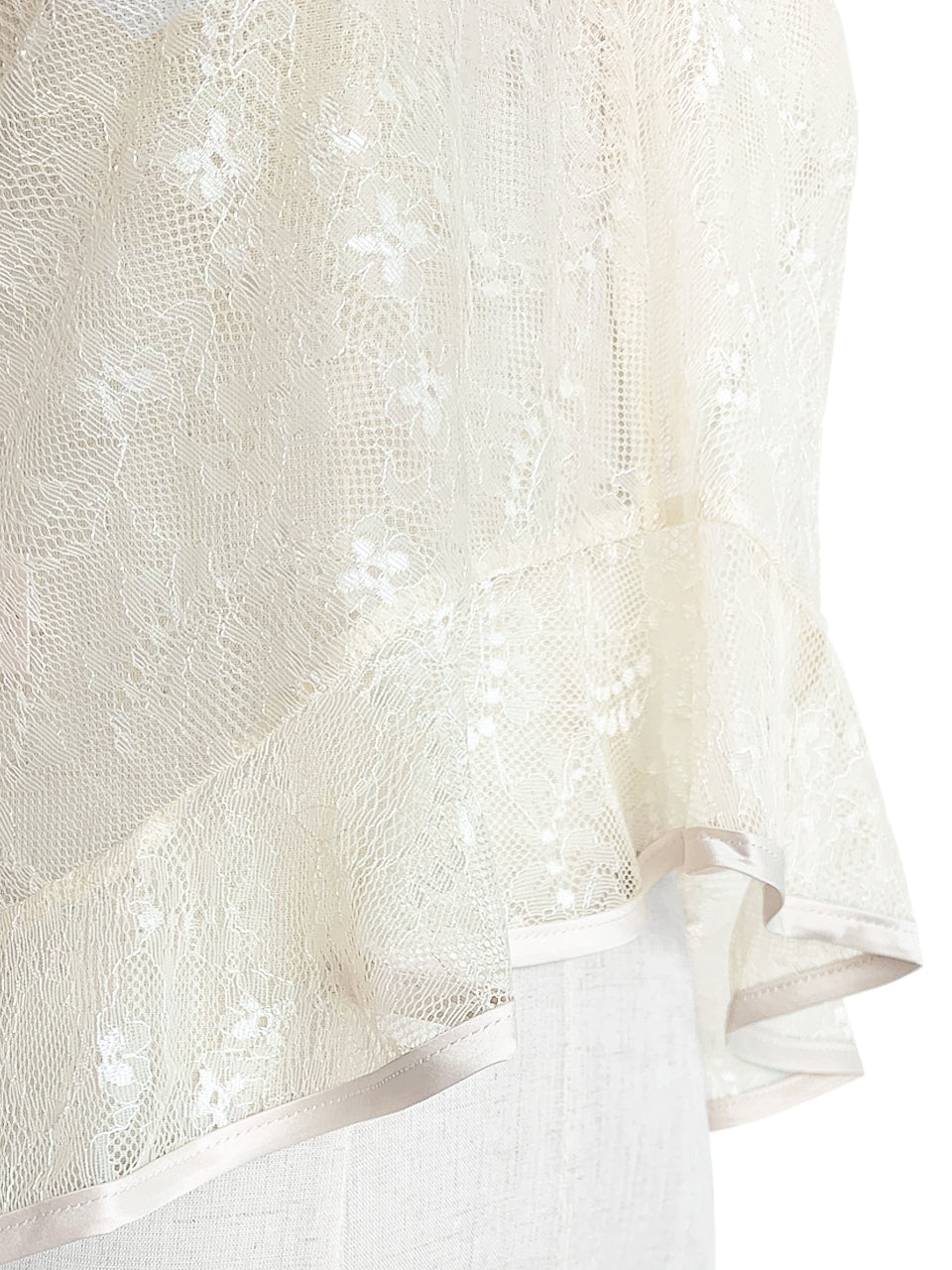 A swingy peplum hem adds romantic detail to this softly marled ivory floral lace on mesh background V-neck blouse