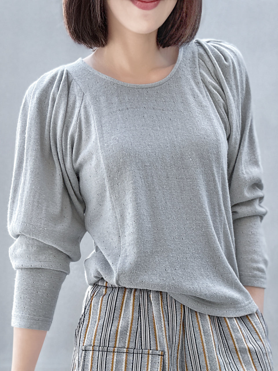Add a touch of sparkle to your wardrobe this season. This soft, drapey top has a lovely feel, with gathered shoulders that create cute puff sleeves. Wear it as elbow-length or long sleeves for a versatile look. Featuring a unique knitted design with tiny holes and shimmering silver threads, it’s perfect for any occasion. Available in soft grey and pale yellow.