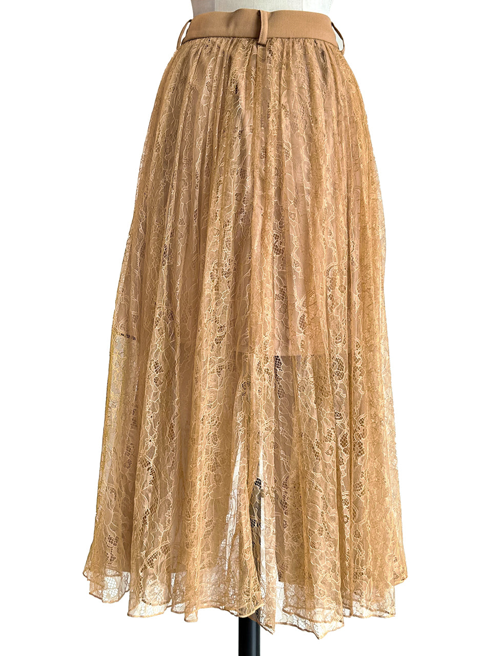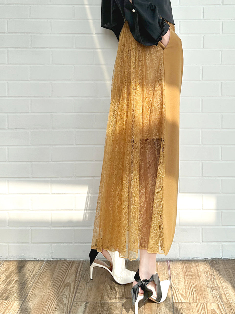Elevate your style with this stylish skirt featuring a unique combination of a pencil skirt front and a stunningly pleated lace back. Designed with convenience in mind, it includes handy side pockets and a practical lining underneath for coverage. This skirt effortlessly blends sophistication and comfort, making it a versatile choice for any occasion. Stay chic and fashionable with this elegant addition to your wardrobe.