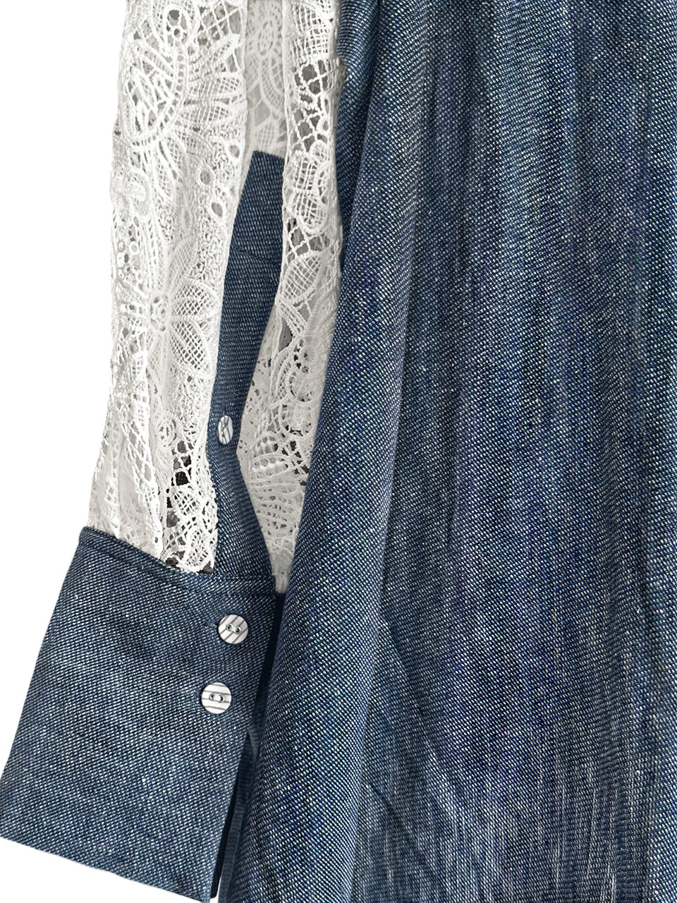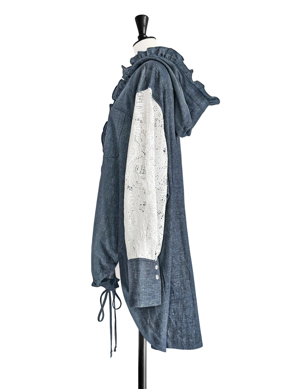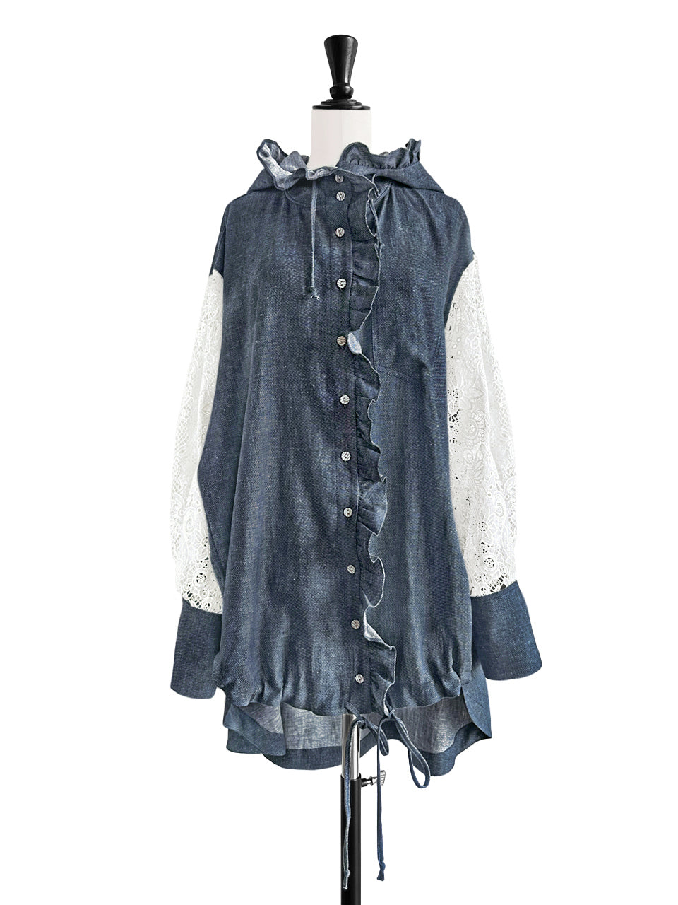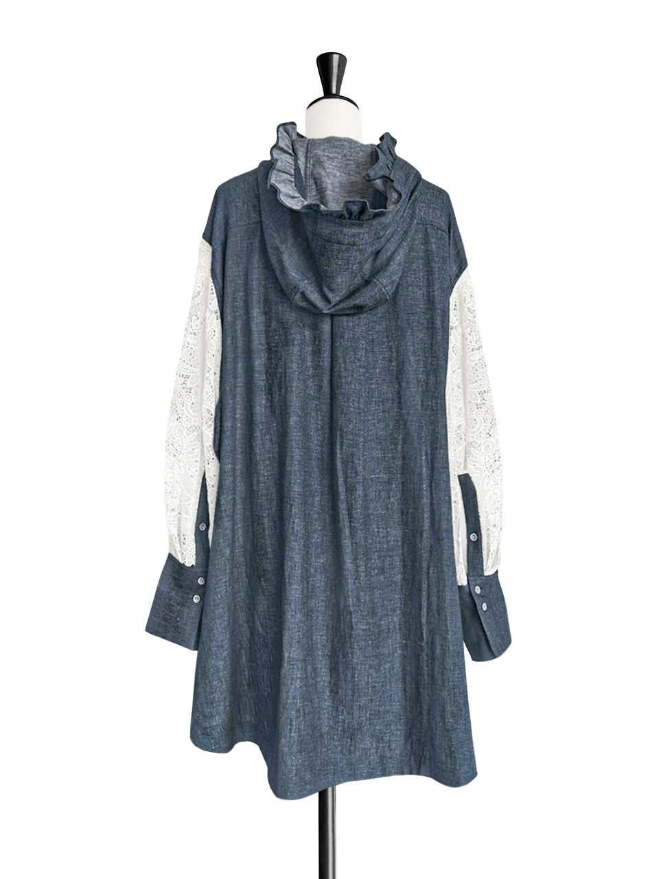 Embrace effortless style with our relaxed-fit light-weighted denim parker. The ruffle encircles the hoodie, while a drawstring hood and front hem offer adjustable style. Its longer back length provides hip coverage, and the fabric-patterned button closure adds a touch of【 T Y N V I E 】vibe. The ivory embroidered lace sleeves and curved hem complete this chic and comfortable look. This kind of parka is suitable for milder weather conditions and adds a unique touch to your wardrobe.