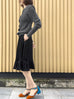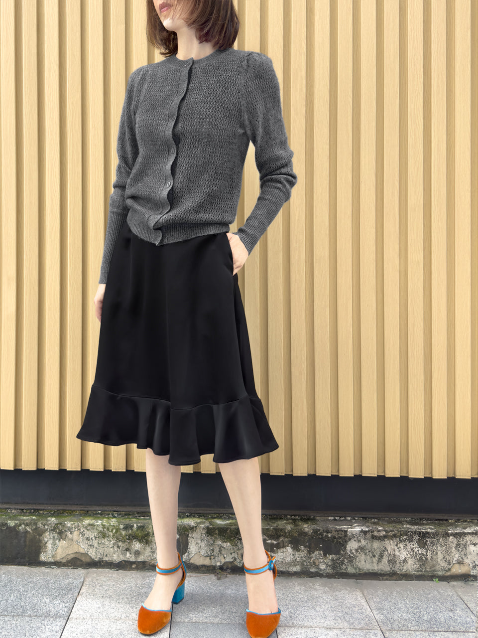 This knee-length skirt in black features a sleek sheen fabric that catches the light. The simple A-line design is flattering and comfortable, with functional side pockets for practicality. The skirt is finished with a playful ruffle hem, adding a touch of femininity to its minimalist silhouette. Perfect for both casual and dressy occasions.