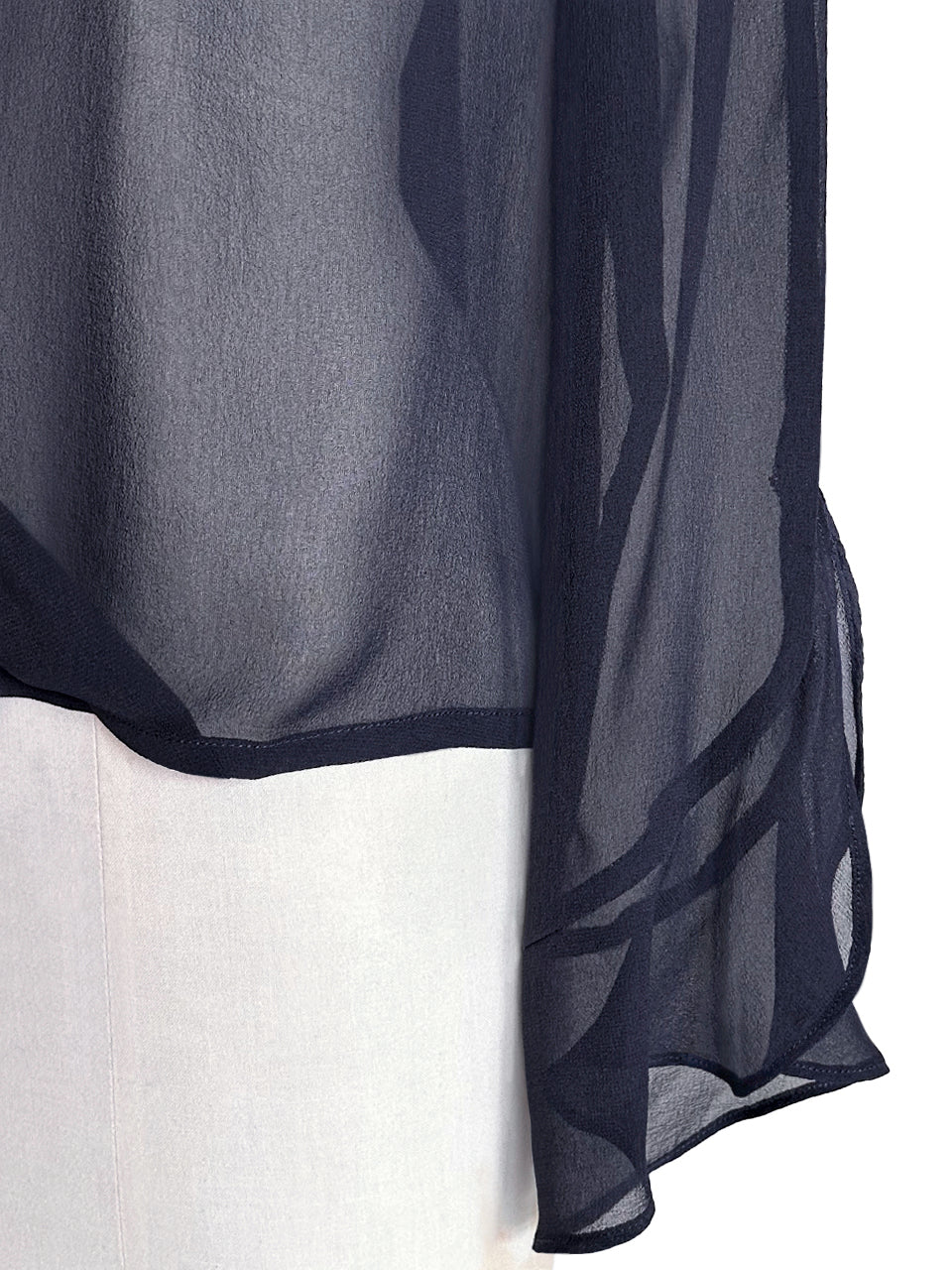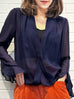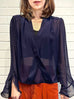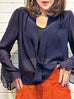 Final Sale! Midnight Ribbon Detail V-neck Frilly Cuffs Silky Blouse