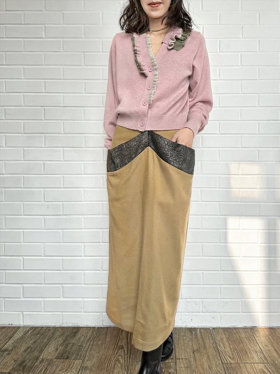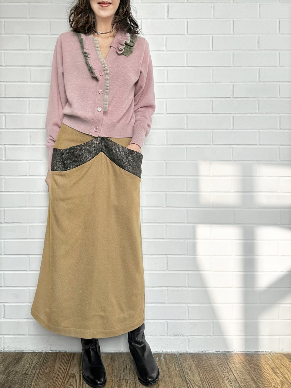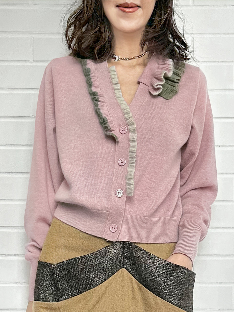 Upgrade your winter wardrobe with our luxurious cashmere wool blend cardigan. The boxy V-neck design meets a touch of sophistication with a multi-colour contrasted ruffles collar. Cozy yet chic, this cardigan is a must-have addition for both casual and dressy occasions. Available in four delicious hue: pink, green, blue and black.