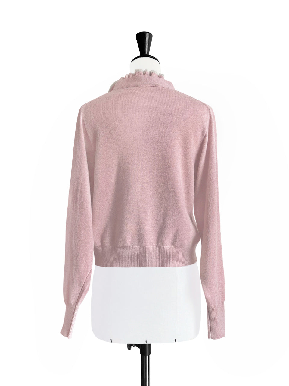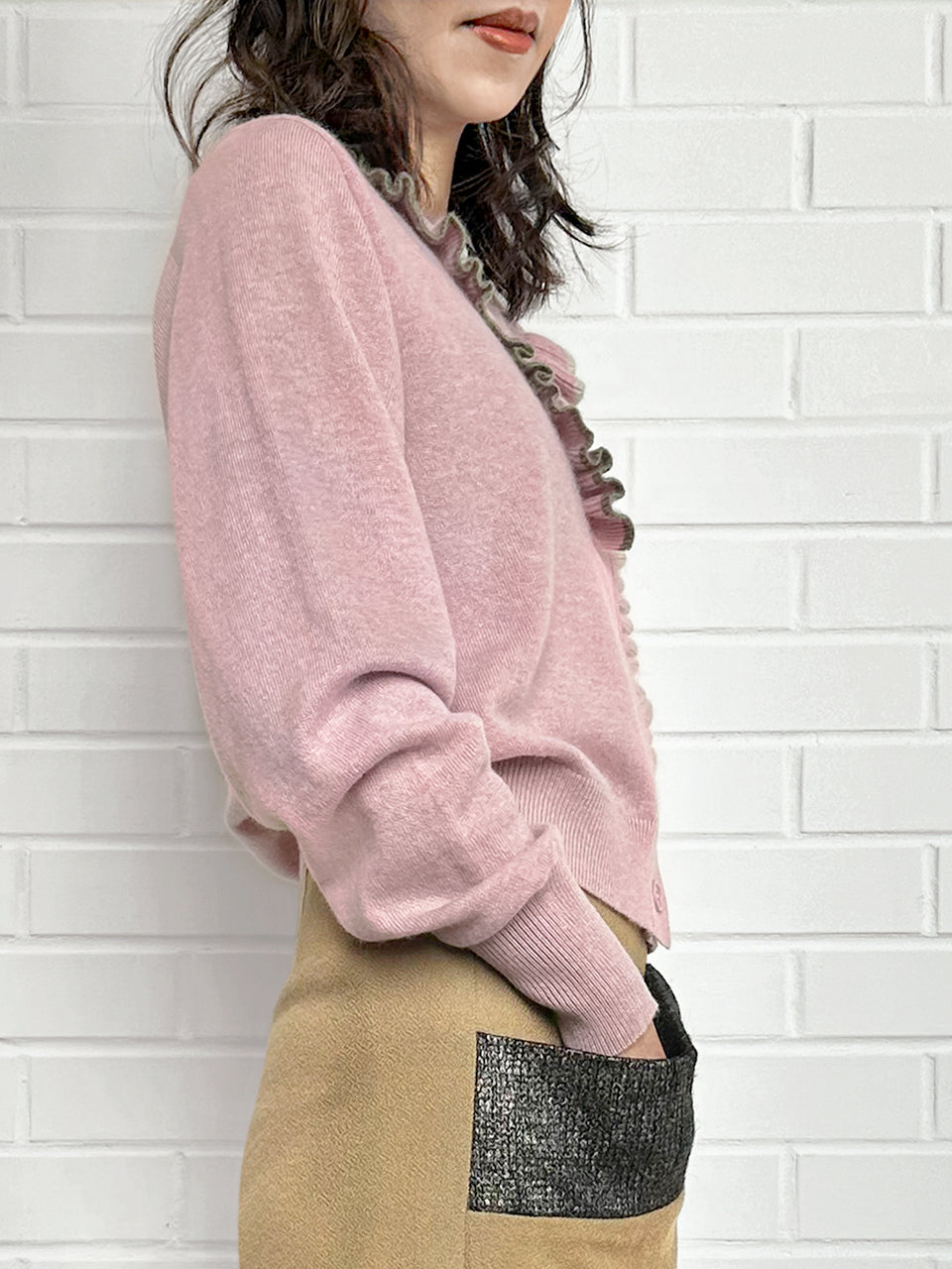 Misty Pink Ruffles Collar Boxy V-Neck Woollen Cashmere Cardigan
