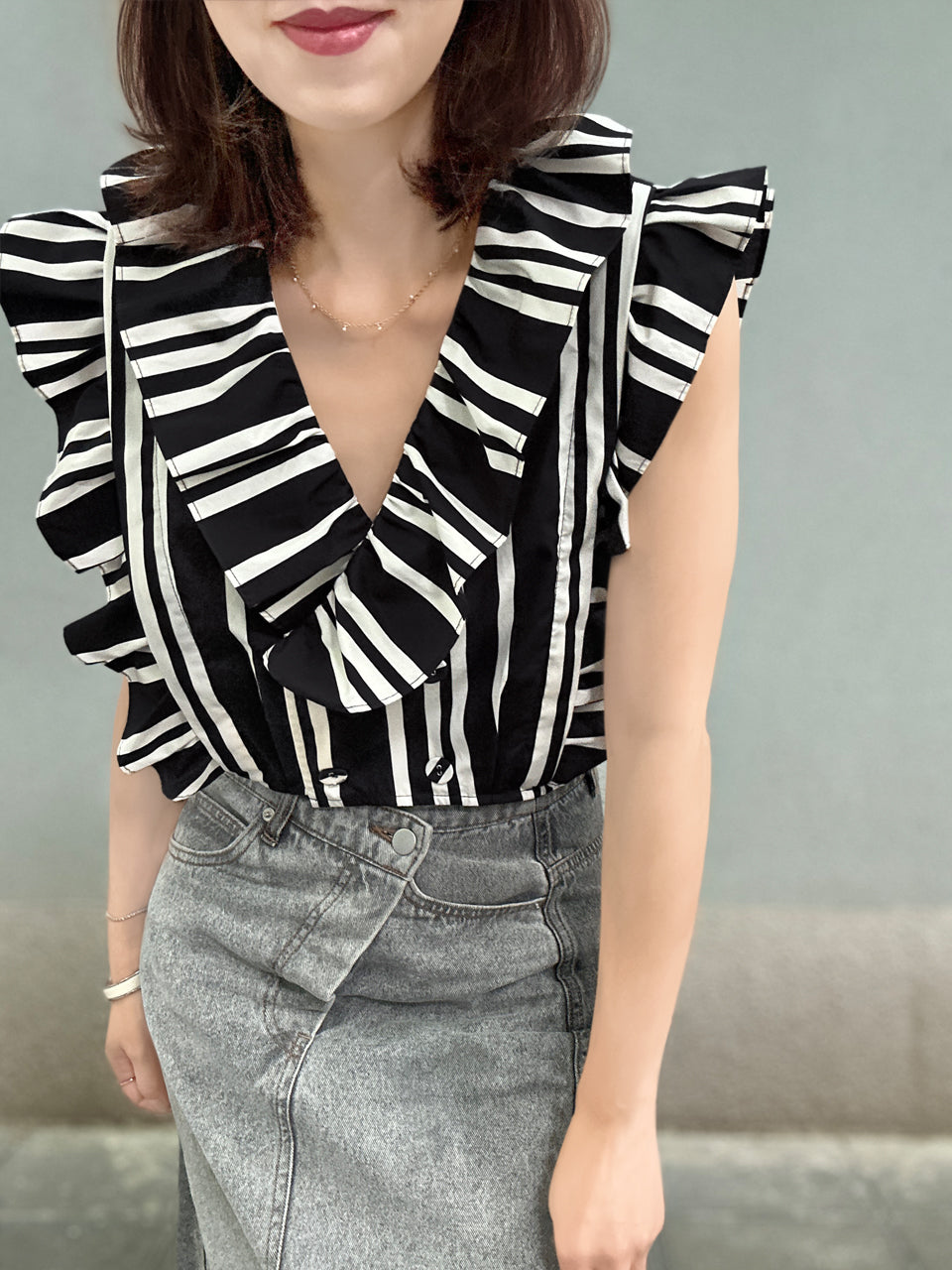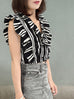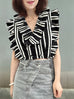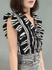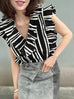 Mono Stripes Double Breasted Ruffles V-neck Crop Top