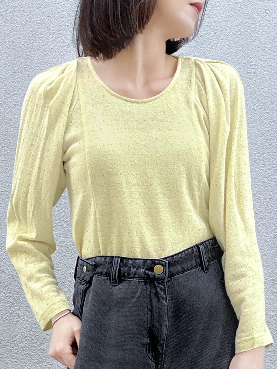 Add a touch of sparkle to your wardrobe this season. This soft, drapey top has a lovely feel, with gathered shoulders that create cute puff sleeves. Wear it as elbow-length or long sleeves for a versatile look. Featuring a unique knitted design with tiny holes and shimmering silver threads, it’s perfect for any occasion. Available in soft grey and pale yellow.