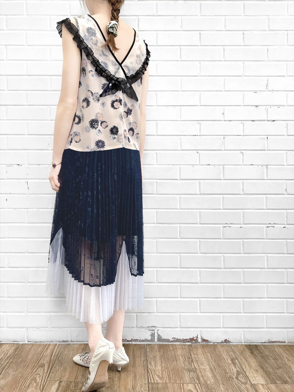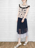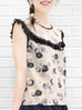 Charm all day long in this breezy top which is set off with frothy frills trimmed cape featuring sheer mesh patterning over a relaxed fit sparkle blossom printed silk tank