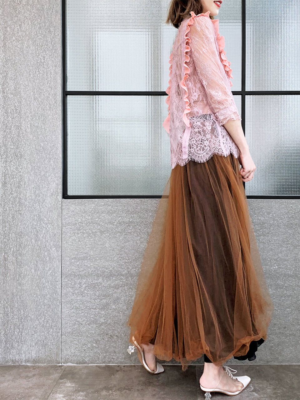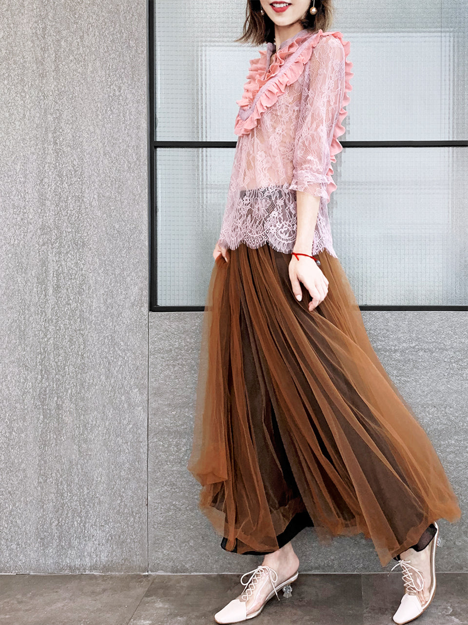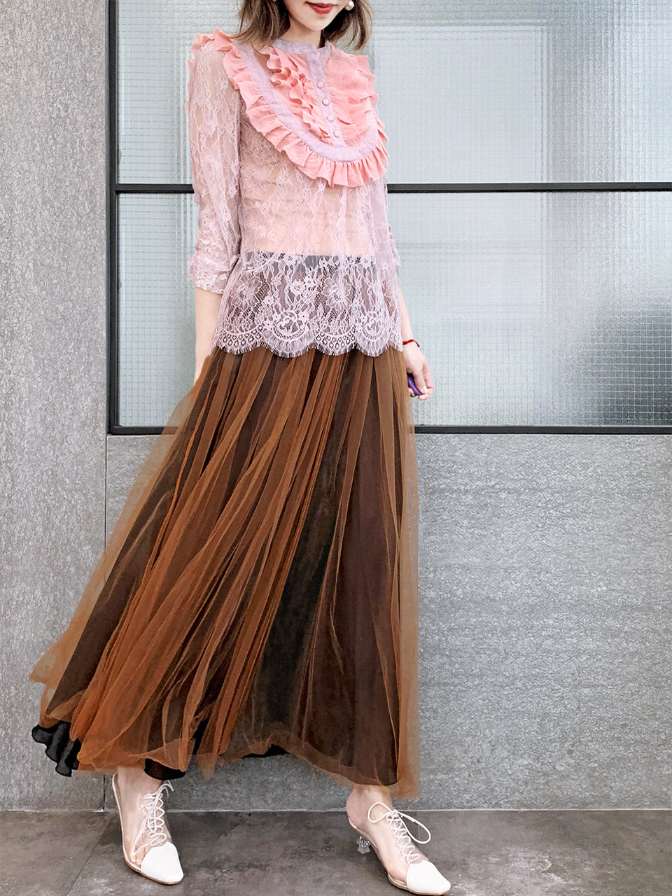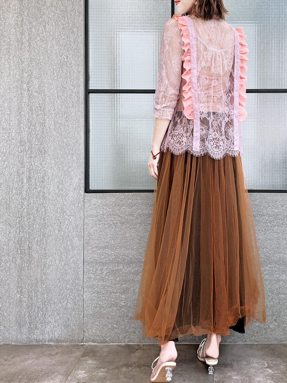 Pinky-Day! Pink Romance Ruffle Collar Sheer Eyelash Lace Blouse