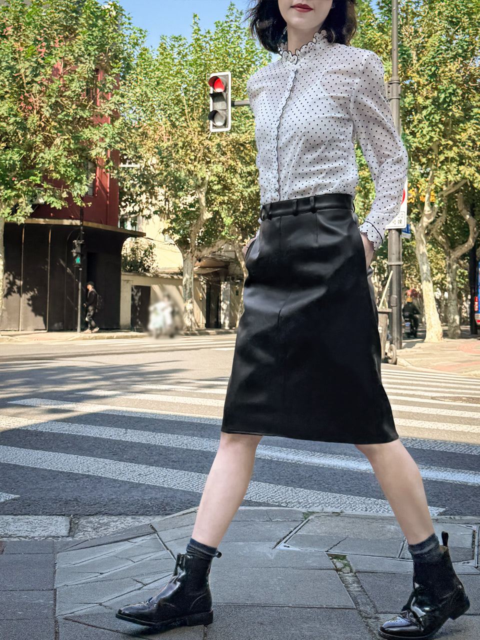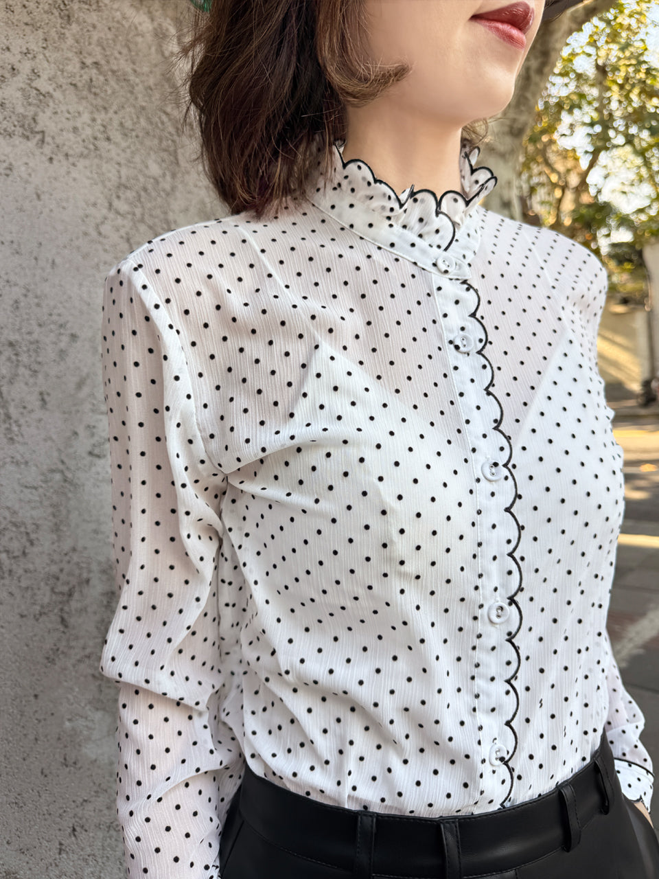 Add a touch of charm to your wardrobe with this polka-dot blouse! Featuring a scalloped collar, hem, and placket with contrast stitching, it's effortlessly elegant. Made from lightweight, airy fabric and finished with tonal buttons, it's perfect for workdays or evenings out. Embrace its feminine, romantic vibe and elevate any outfit with ease!