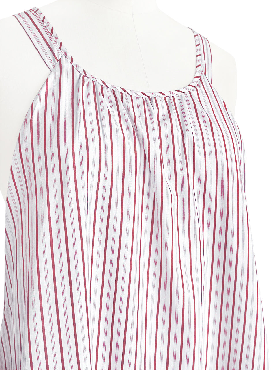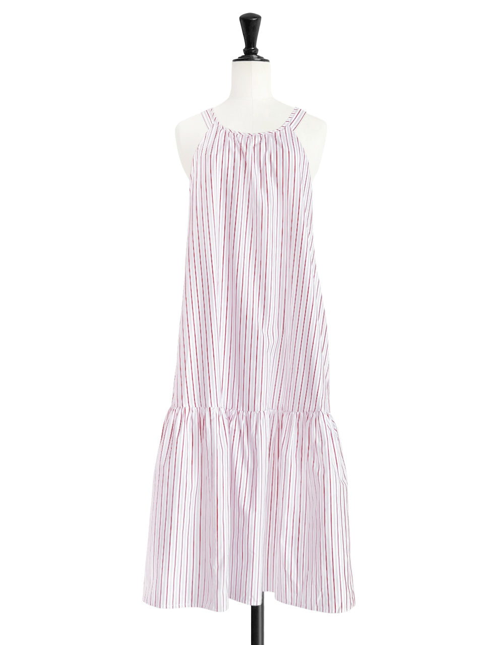 Here is a charming sundress that wouldn't look out of place in a French market, paired with a wide-brimmed hat on a summer's day. It features chic stripes in a lightweight fabric and a halter neckline. The dress is lined with a mesh hem lining, creating a beautiful flowy A-line silhouette. It's the loveliest piece, perfect for packing in your suitcase.