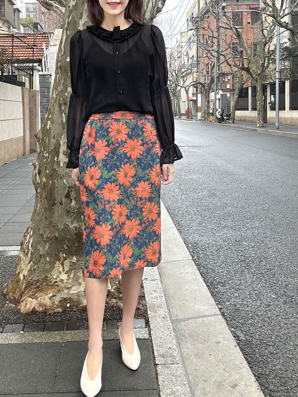 Herewith our darling spring blouse, embellished with a pleated ruffled collar for a delightful touch. Secured with tonal fabric-covered buttons, it features flattering puff shoulders and gathered tier sleeves, adorned with feminine ruffles along the cuffs. Versatile and chic, it pairs effortlessly with jeans or wide-leg pants for a stylish ensemble.