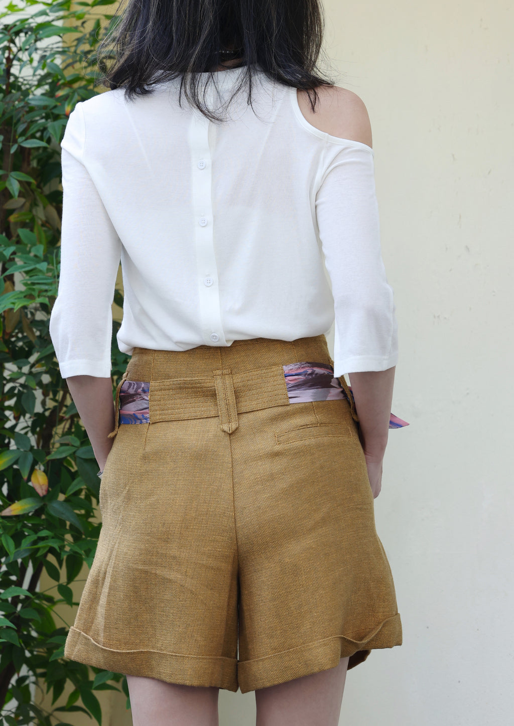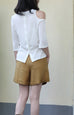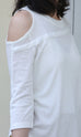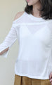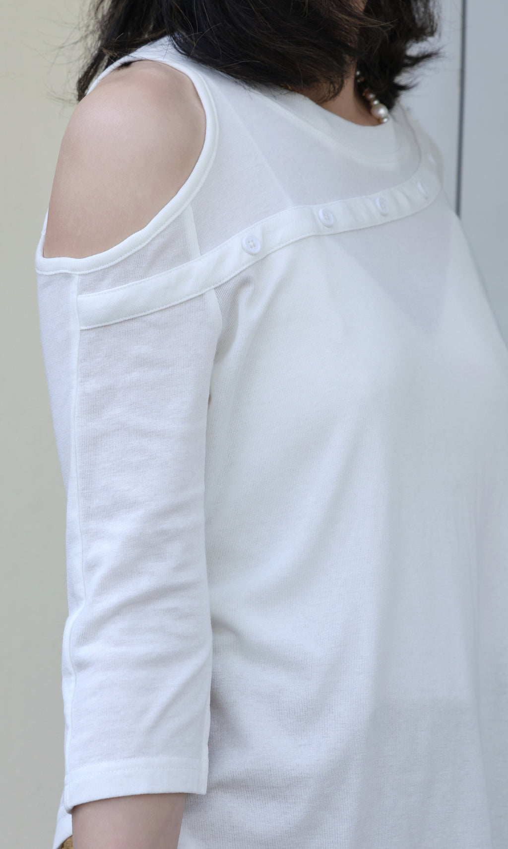 A fresh twist on everyday cool—this cotton blend tee turns heads with its asymmetrical cut-off shoulder, eye-catching button details across the chest and back, and a subtly sculpted neckline. With elbow-length slit sleeves and three easy-to-style colourways, it’s the kind of piece you’ll reach for again and again. Don’t wait—this one won’t stay in stock. Available in white striped on black, black striped on white and, solid white.