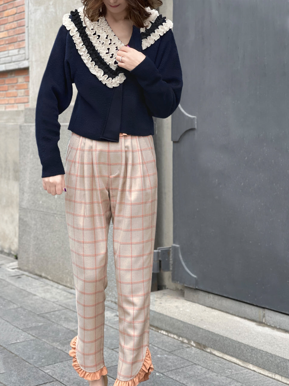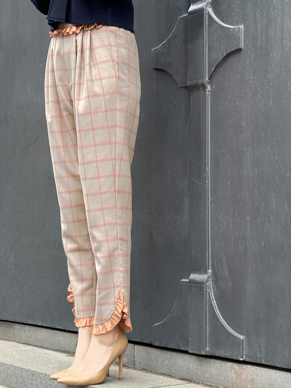 If early Spring means we are back in our taper pants again, let's make them a little elevated. At T Y N V I E, we've cropped ours and added an ankle cuff and ruffle, plus our signature ruffles at the waistline. Super drapey fabric, they're available in woolly orange check, and solid black and are proof that comfort and style can be happy bedfellows.