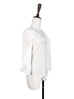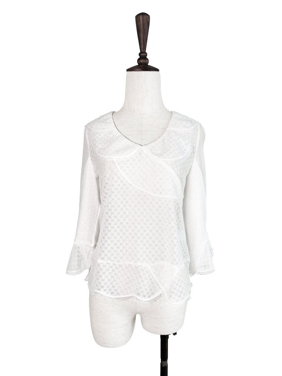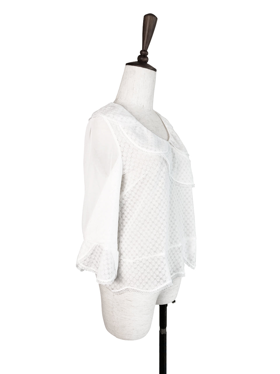 Girlish frills trim a soft blouse fashioned with a demure, oversized petal collar and shot through with gorgeous see through lace