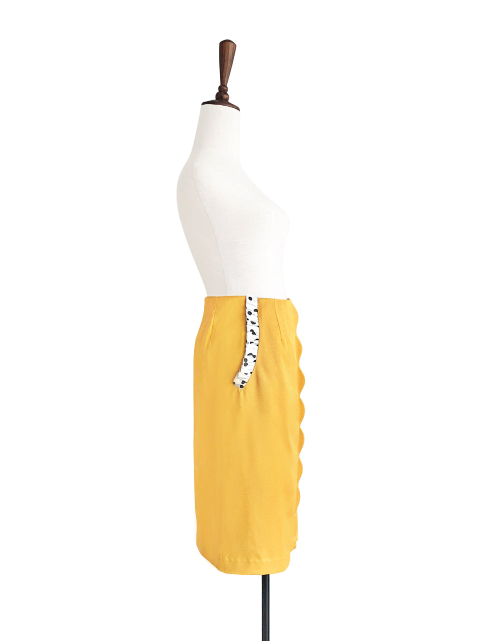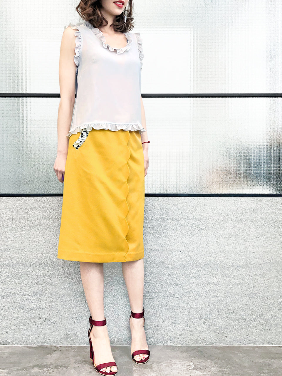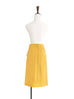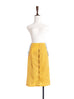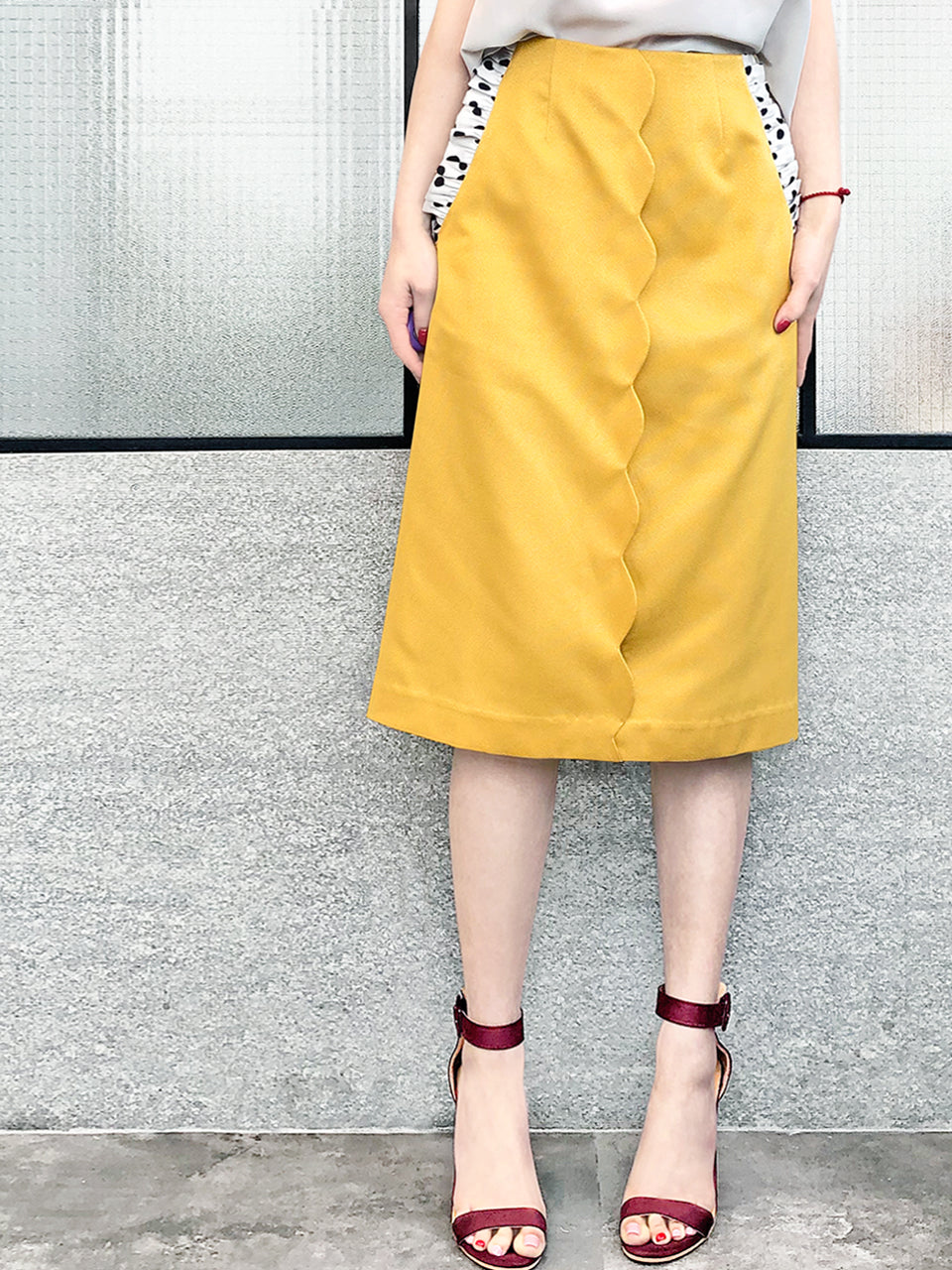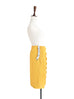 Thoughtfully placed unstitches scallop front detail play up feminine volume curves in this fitted pencil skirt cut from textured yellow blocks fabric that smoothly conforms to the figure
