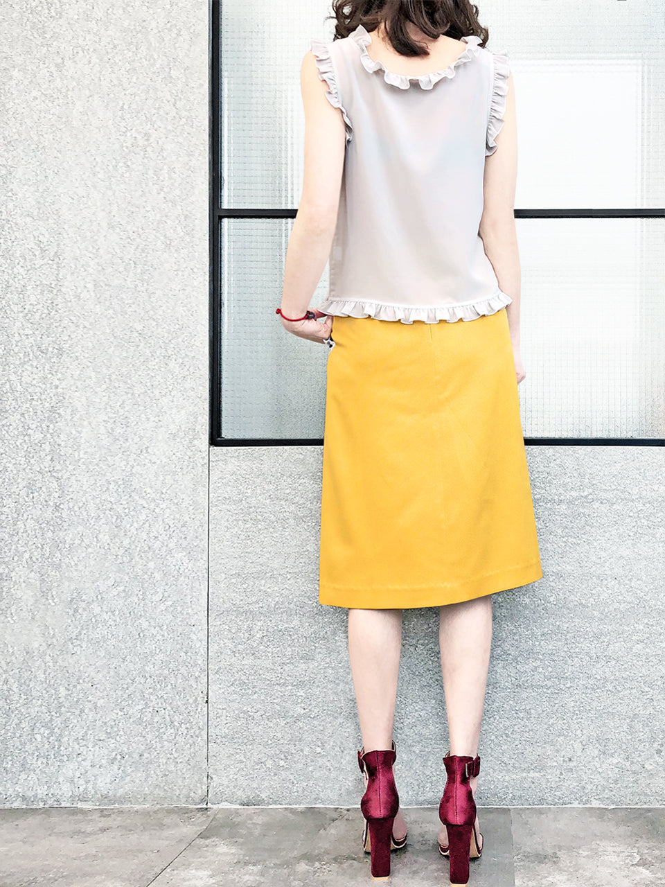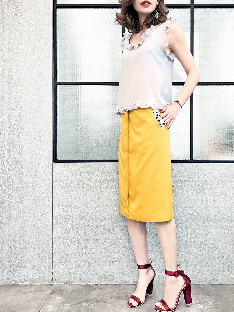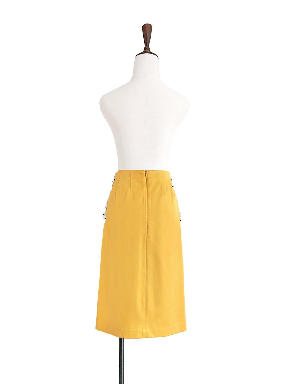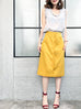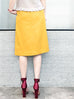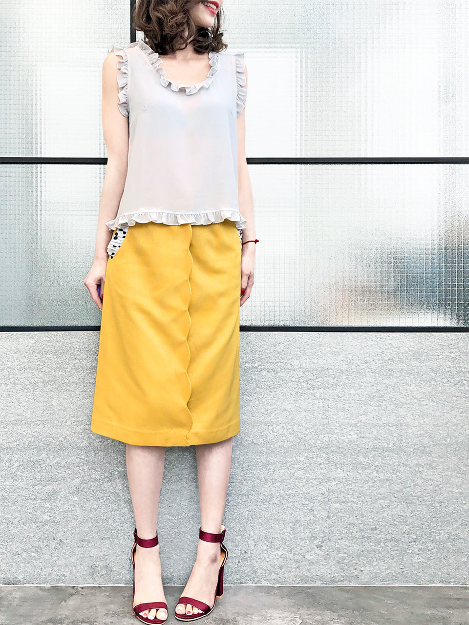 Thoughtfully placed unstitches scallop front detail play up feminine volume curves in this fitted pencil skirt cut from textured yellow blocks fabric that smoothly conforms to the figure
