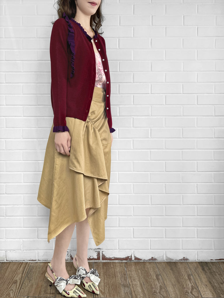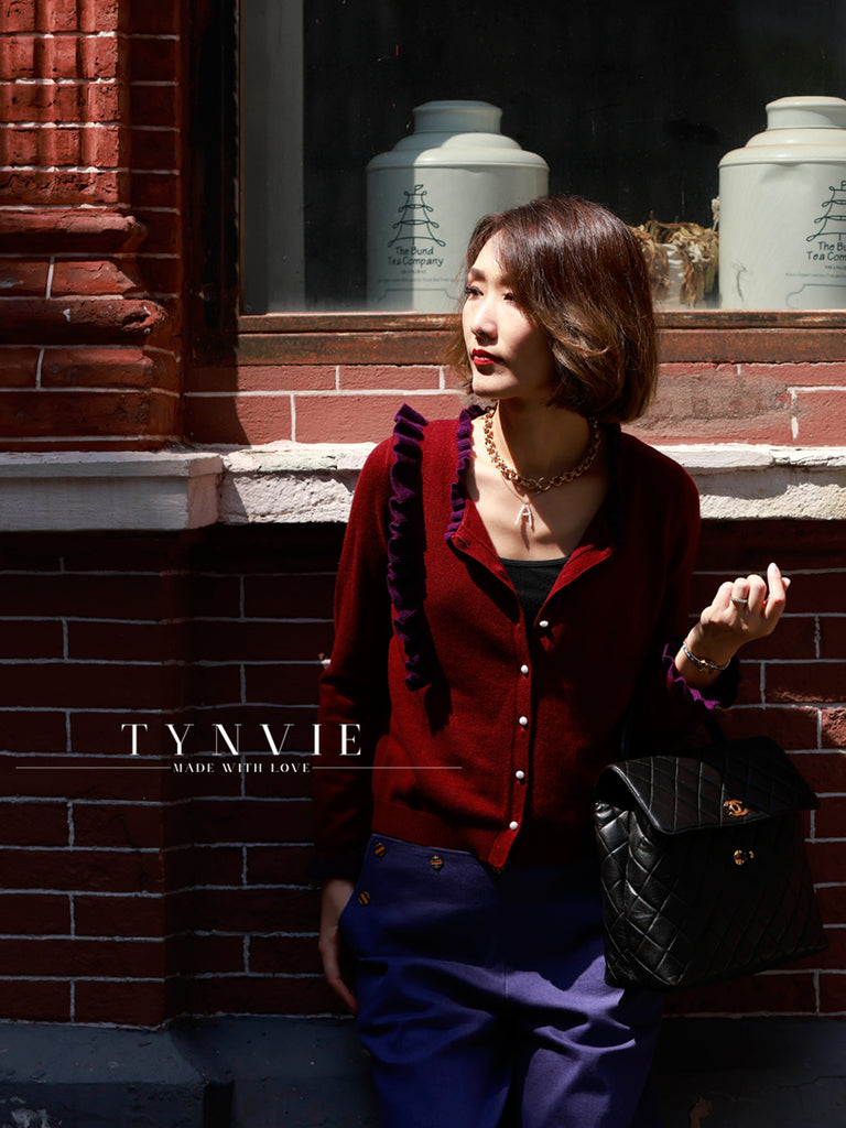 寶藍色荷葉邊領寬鬆 V 領羊毛羊絨開襟衫