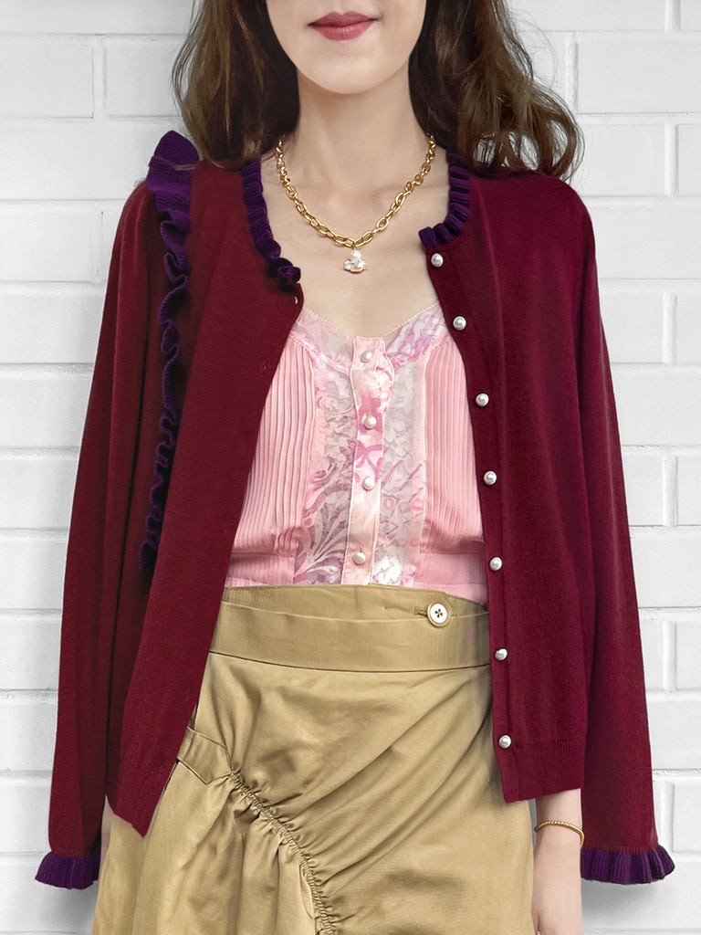 優雅黑色荷葉邊領寬鬆 V 領羊毛羊絨開襟衫
