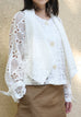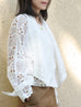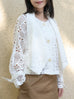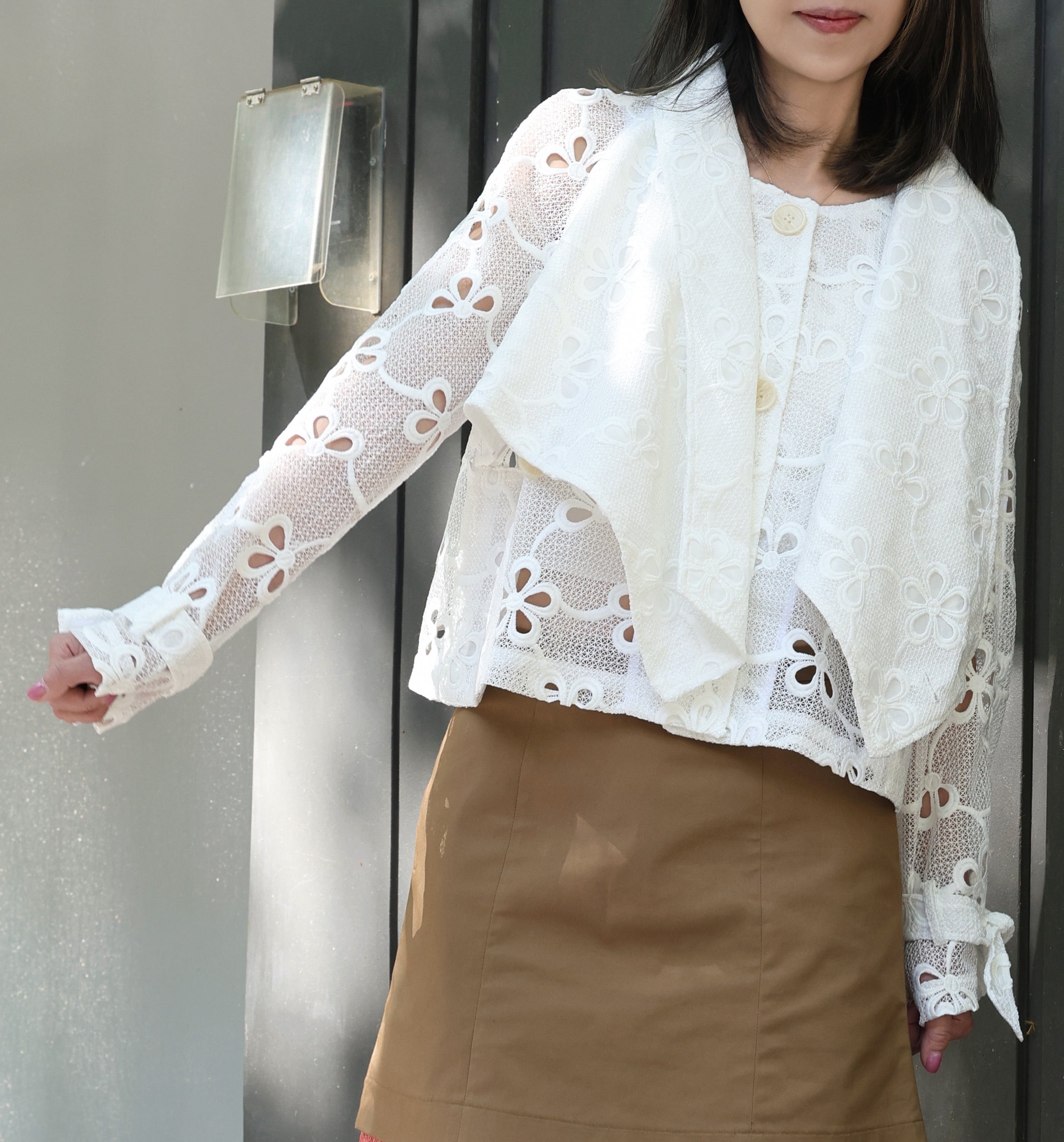 Delicate and feminine, this white lace jacket features an elegant scarf collar and all-over floral cutout embroidery. The lightweight, semi-sheer fabric adds a soft, airy feel, perfect for layering in spring and summer. With its relaxed fit and charming tie cuffs, it brings effortless grace to any outfit — dress it up or down with ease.